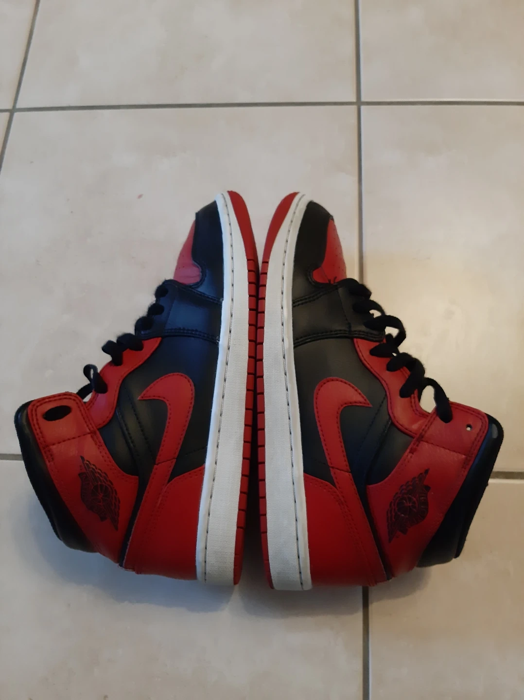 These are Air Jordan 1 Mid sneakers in a red and black colourway. Leather upper with a rubber sole. Lace-up closure. Size 8