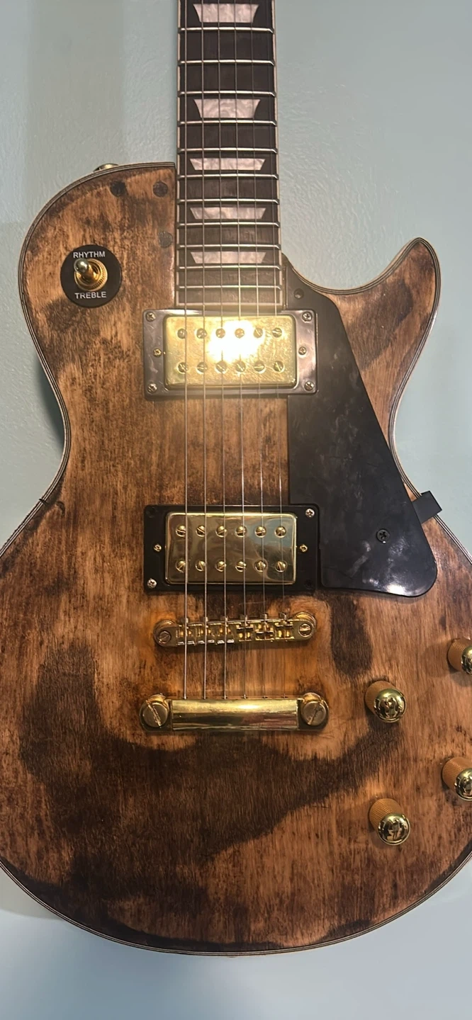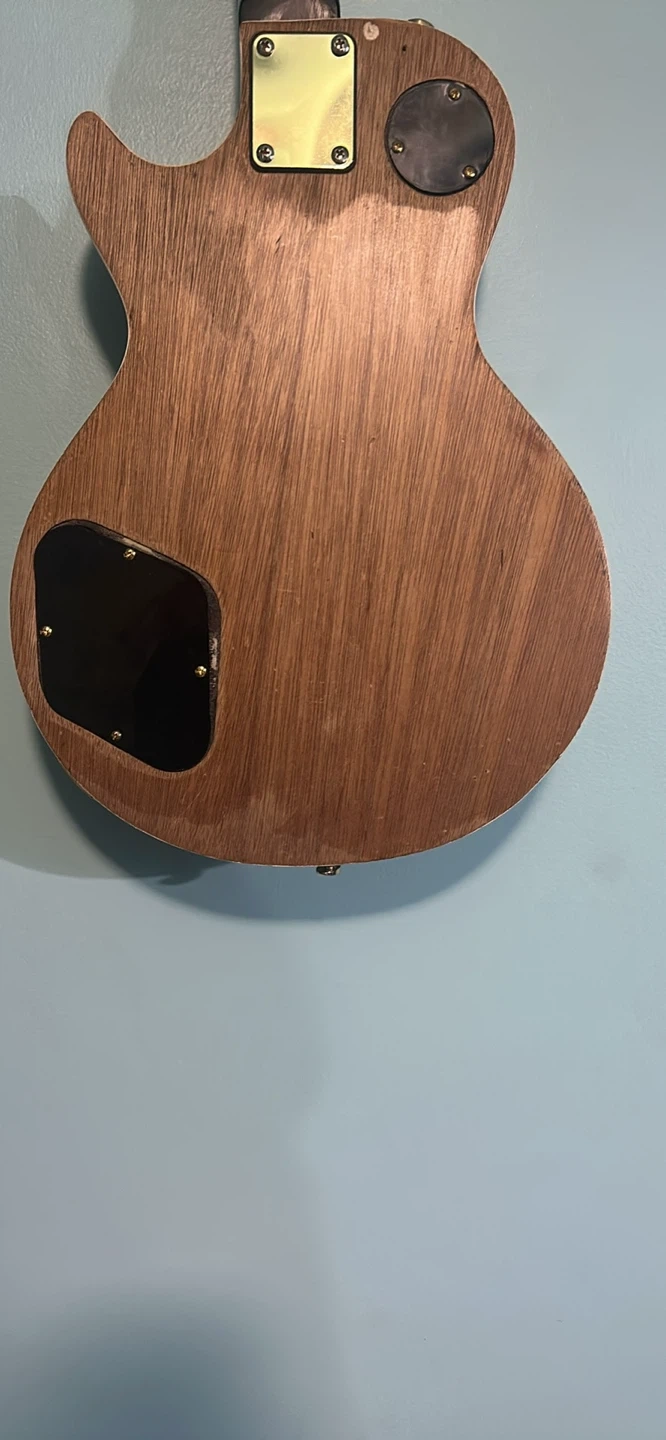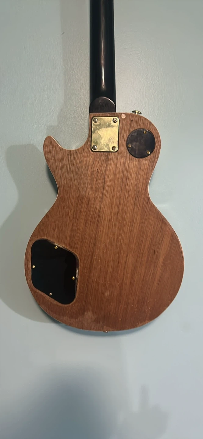 Selling an electric guitar in the Les Paul style. It has a wood finish with gold hardware. it needs some work on the frets and the wiring needs to be better as the guitar buzzes