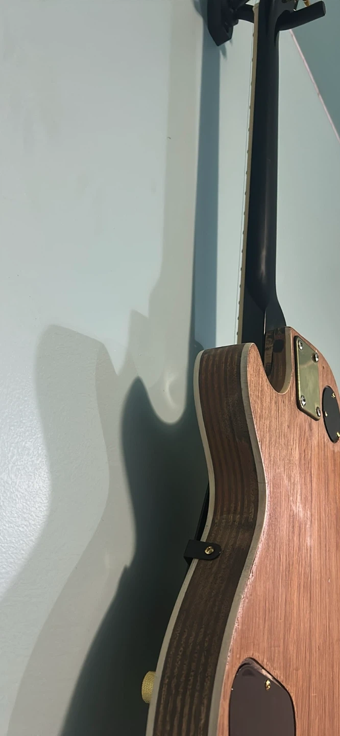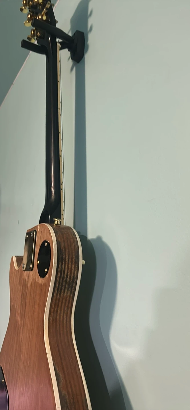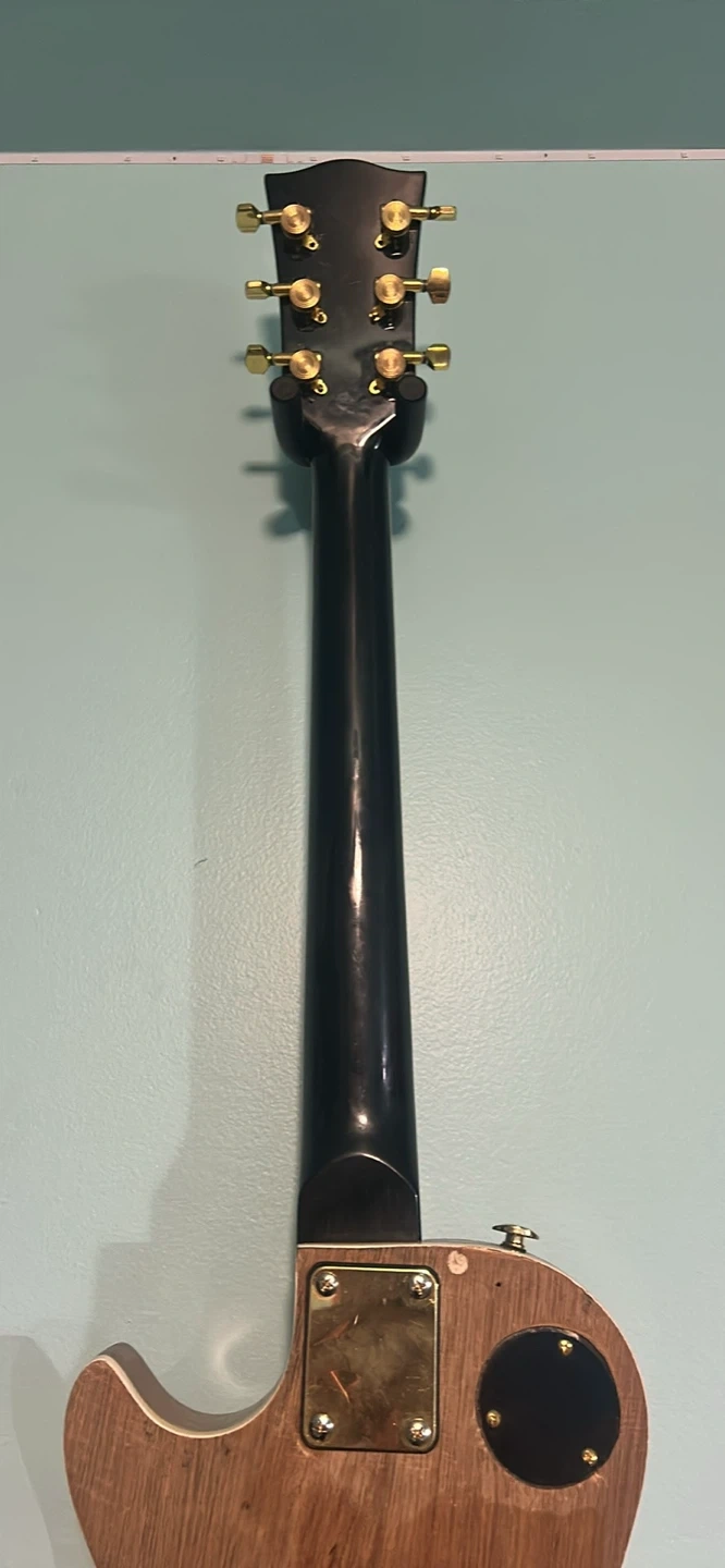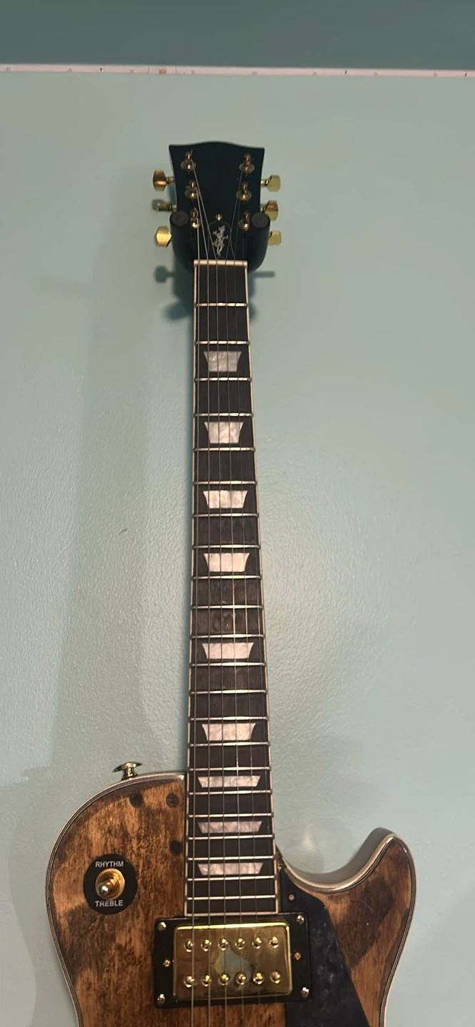 Selling an electric guitar in the Les Paul style. It has a wood finish with gold hardware. it needs some work on the frets and the wiring needs to be better as the guitar buzzes
