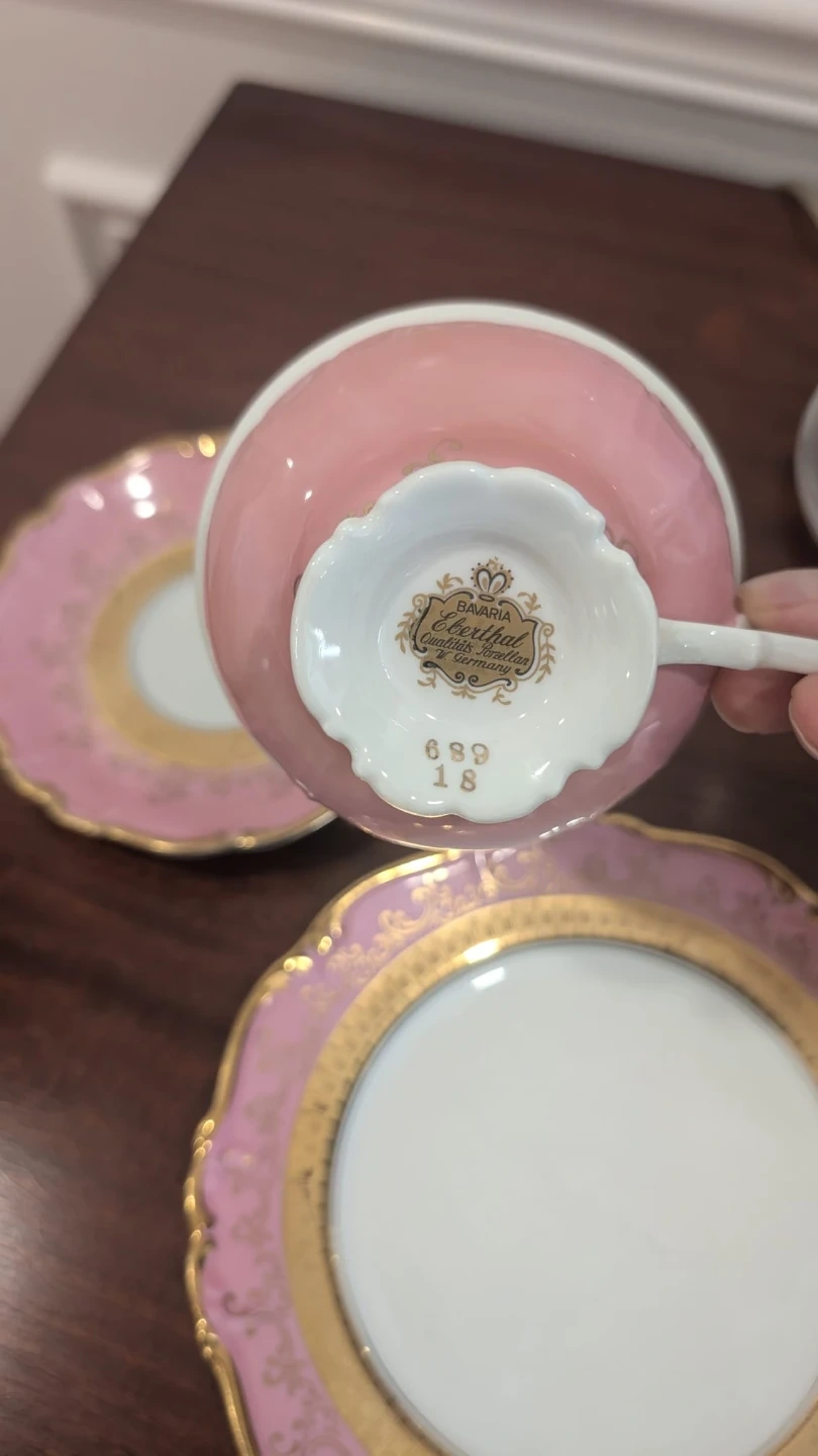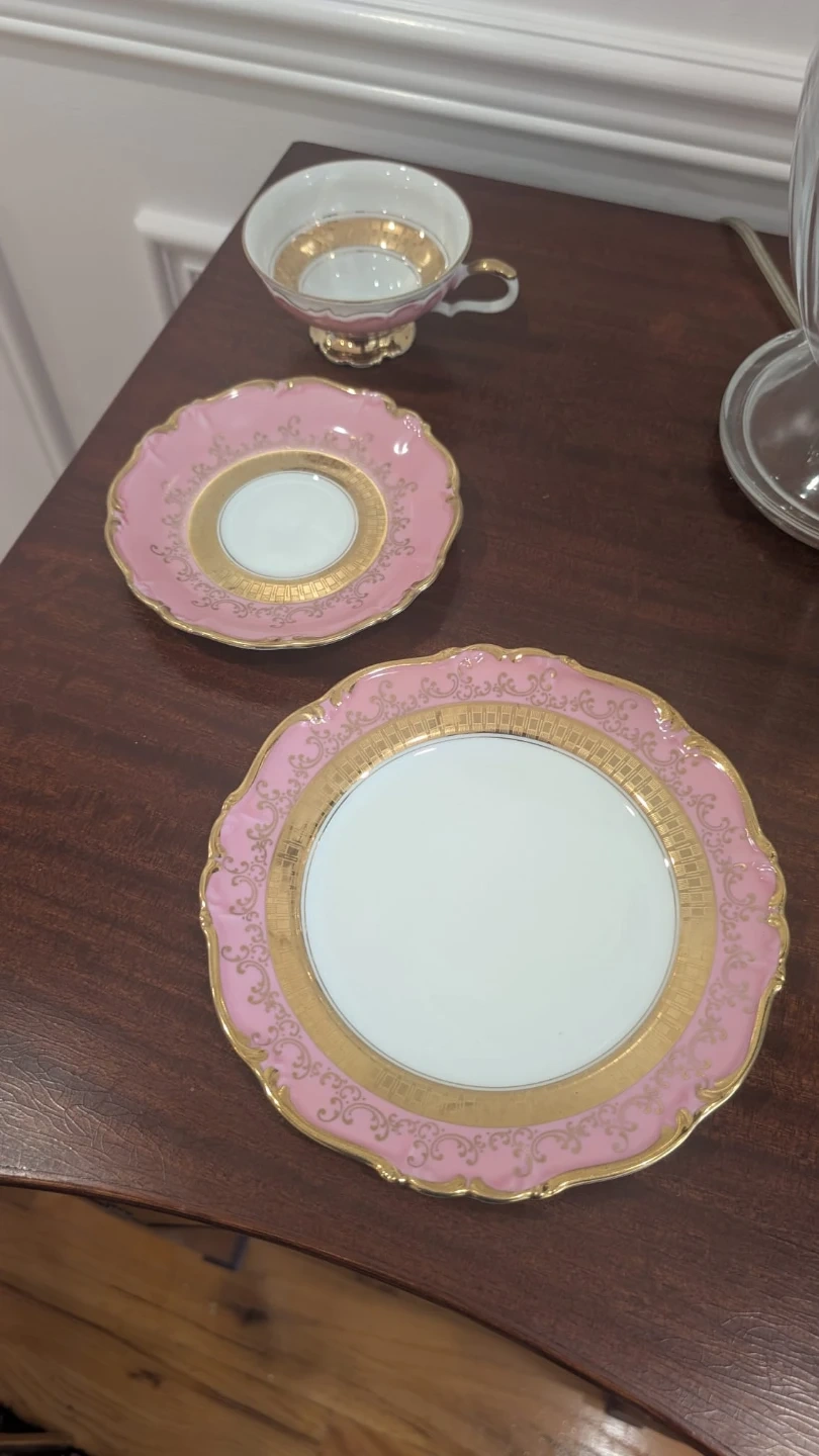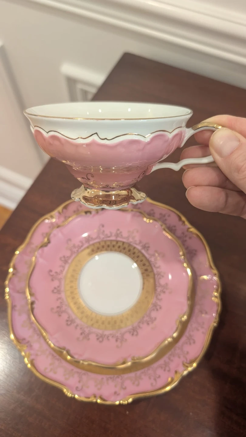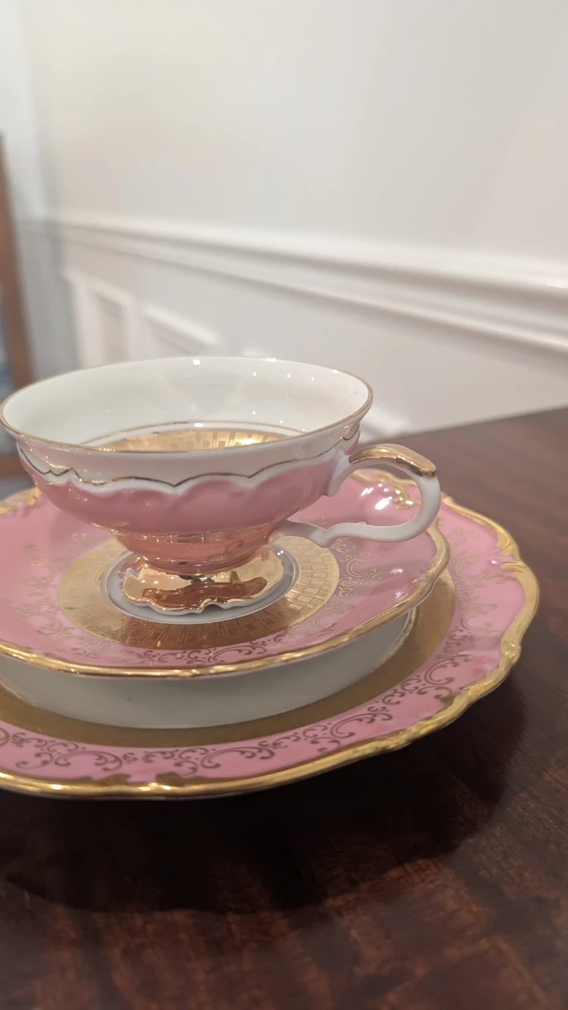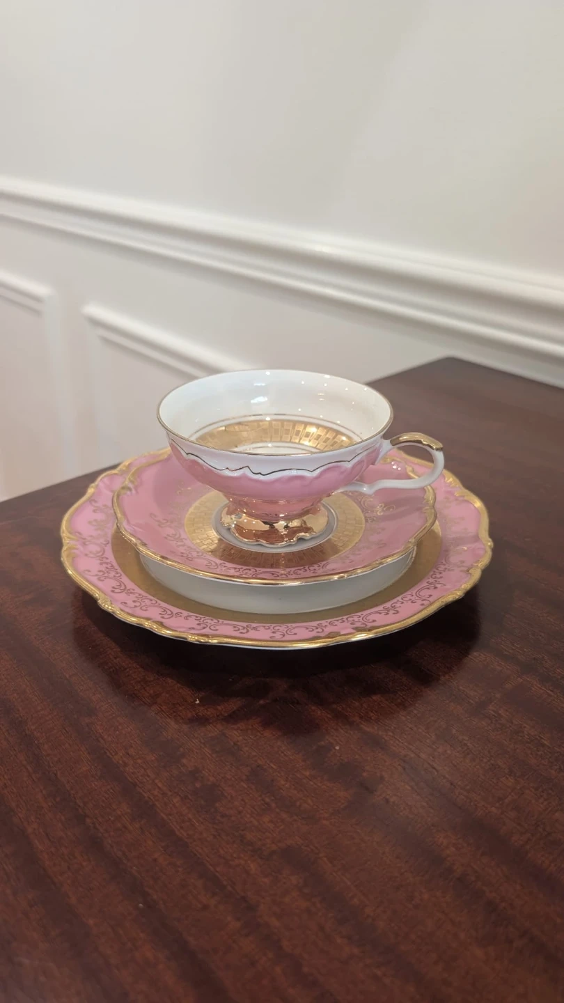 This elegant tea cup trio features a delicate pink porcelain with ornate gold detailing. It includes a teacup, saucer, and dessert plate. Perfect for enjoying a classic afternoon tea experience! Made in West Germany