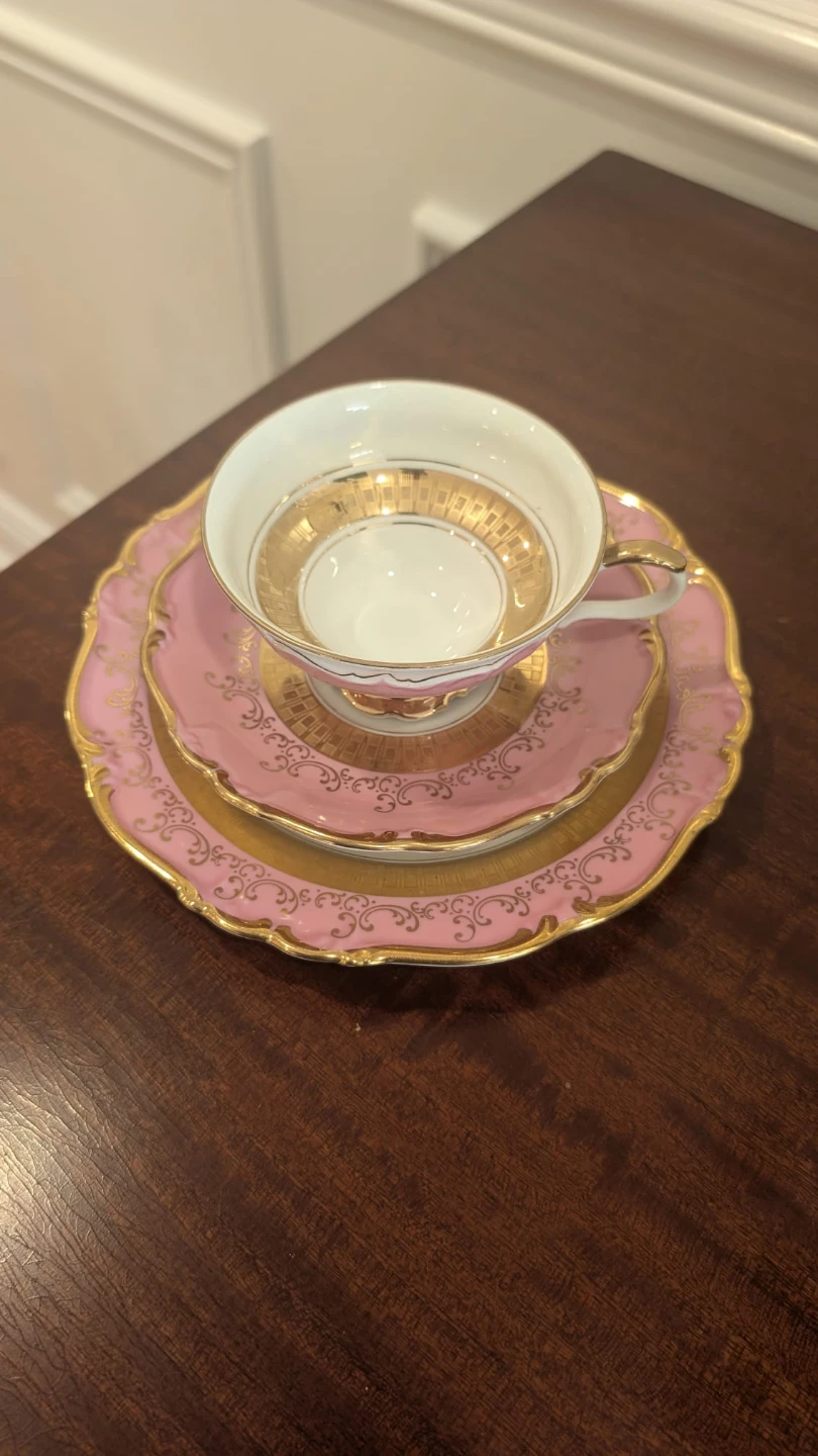 This elegant tea cup trio features a delicate pink porcelain with ornate gold detailing. It includes a teacup, saucer, and dessert plate. Perfect for enjoying a classic afternoon tea experience! Made in West Germany