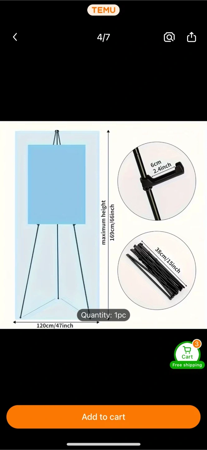 This black metal tripod easel is perfect for displaying artwork or signs. It has a maximum height of 165cm/66 inches and a width of 120cm/47 inches. It includes a carrying bag for easy transport. This easel is suitable for event displays or artists needing a stable stand.