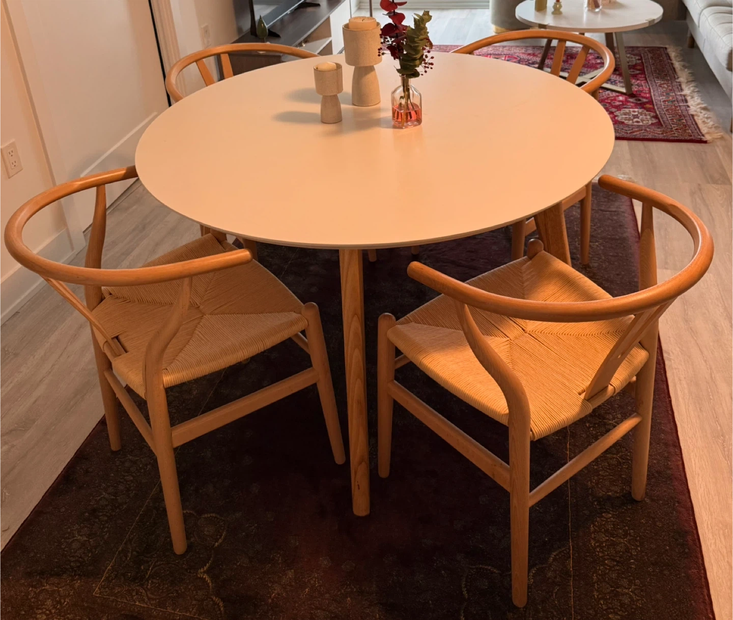 Selling a lovely round dining table paired with four wishbone chairs. The table features a clean, white top and a sturdy base. The chairs are made of natural wood with woven seats, adding a touch of Scandinavian design to your dining space. Perfect for a cozy dining area or kitchen!