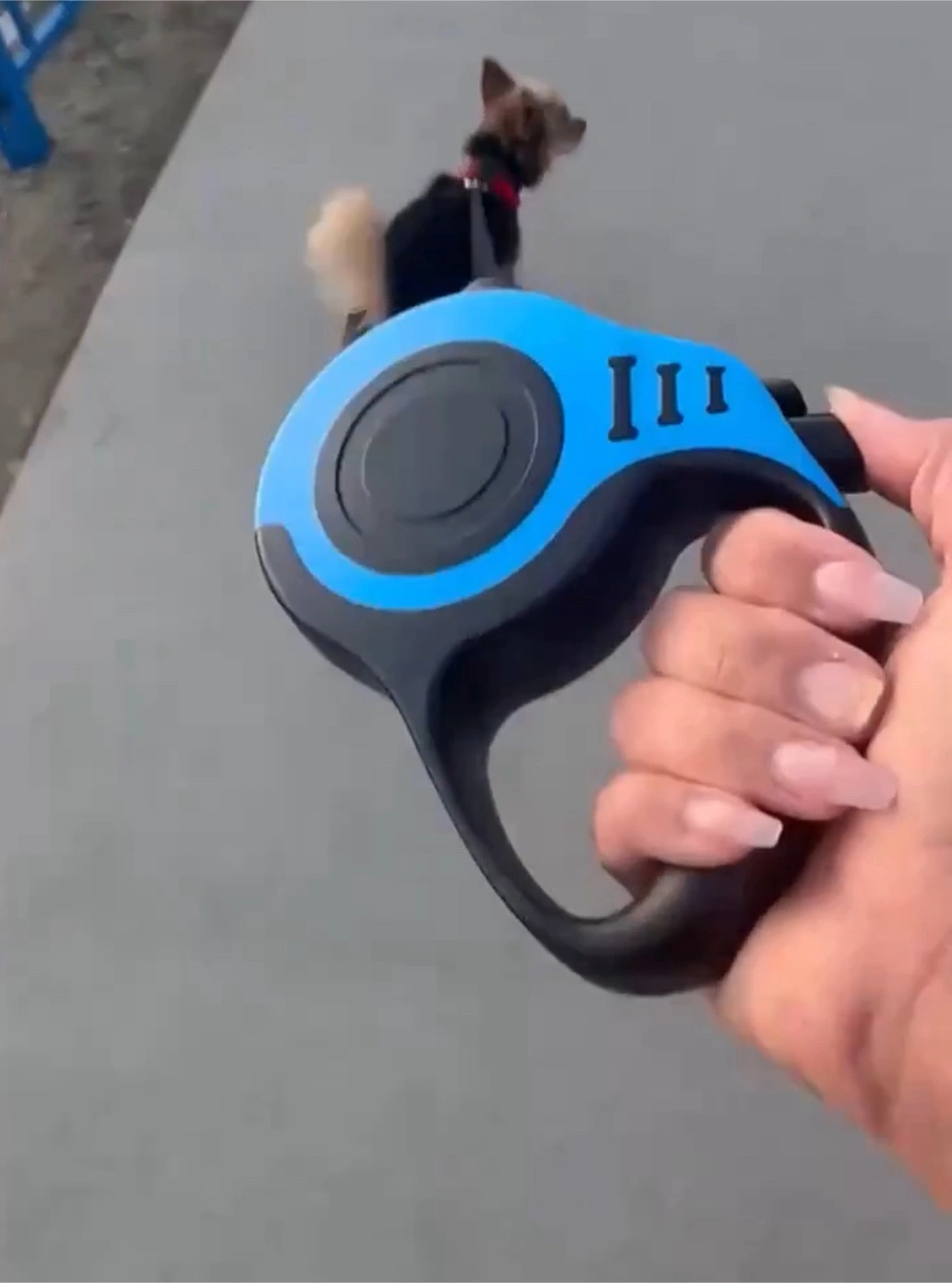 This is a retractable pet leash. It's in great shape and ready for your furry friend's next walk! The handle is black and comfortable to grip.