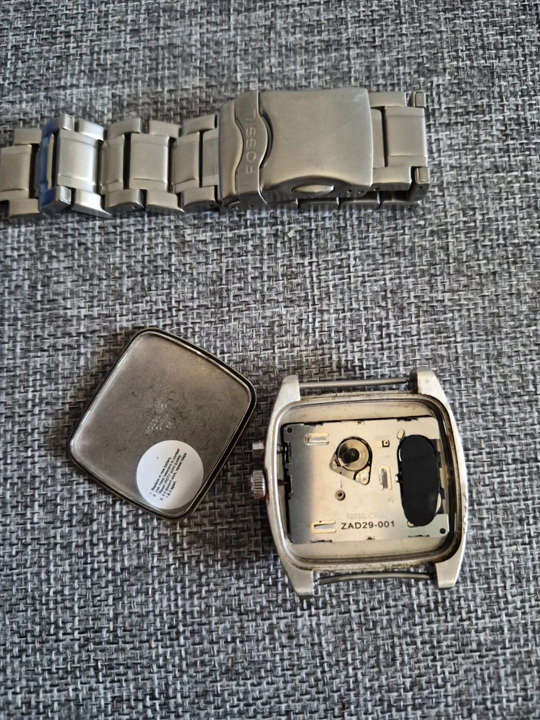 This is a Fossil stainless steel men's watch. It has a silver metal band with a deployment clasp and the Fossil logo. The watch is not working.