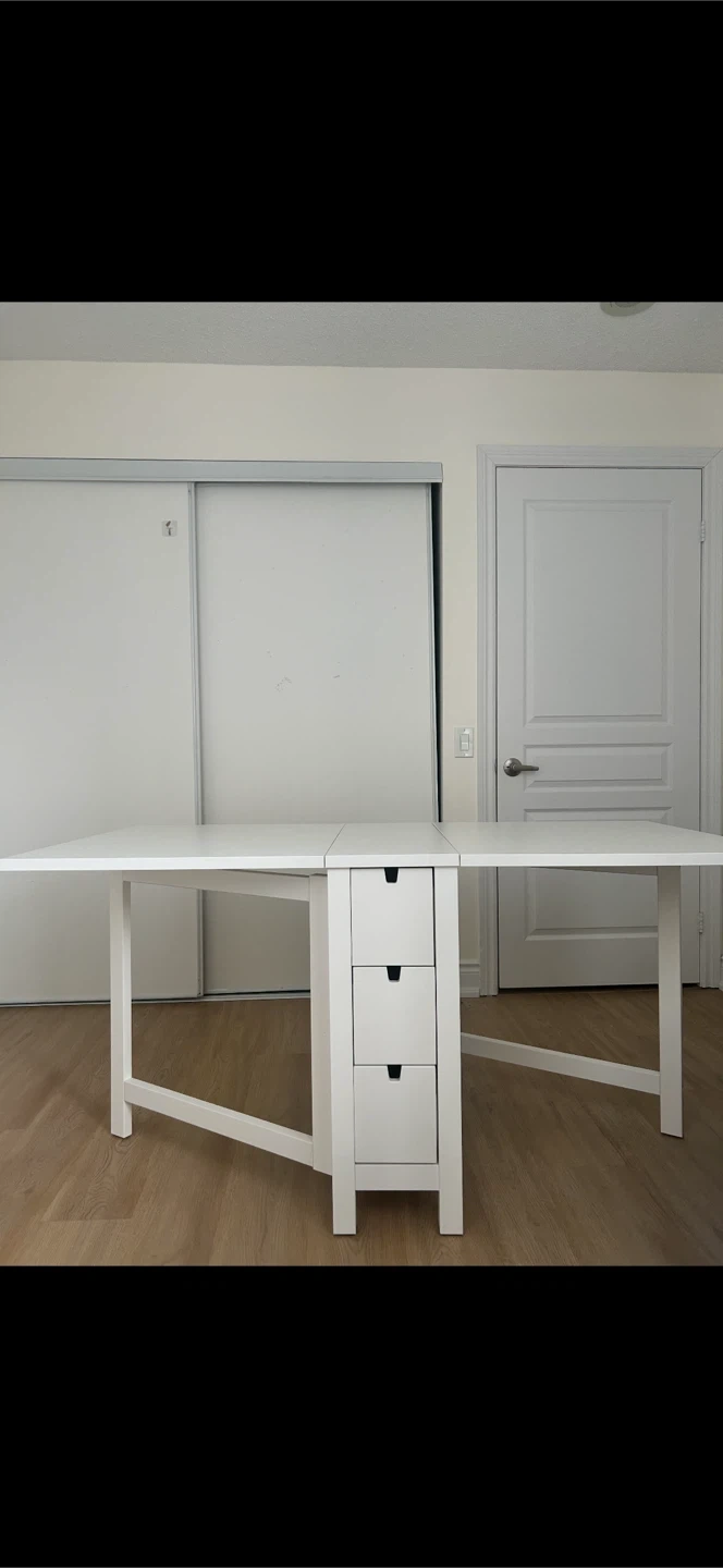 A versatile white folding desk featuring a convenient set of three drawers. It's perfect for small spaces or for adding extra workspace when needed. The design allows for easy folding and storage.