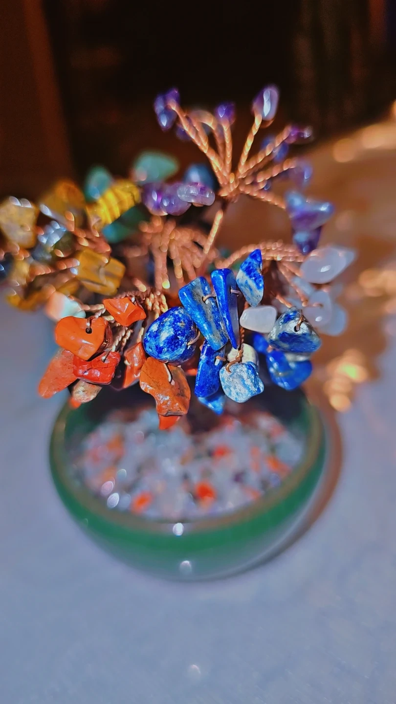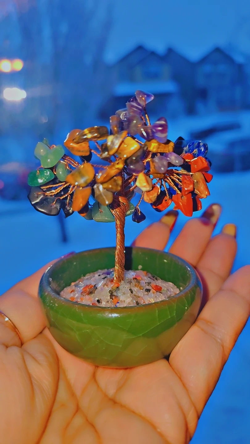 This is a beautiful crystal gemstone tree in a green pot. It's a lovely decorative piece for any room! It has lapis lazuli , green aventurine, Amethyst ,Red jasper , tiger eye , rose quartz &blk obsidian. 7 chakra tree .