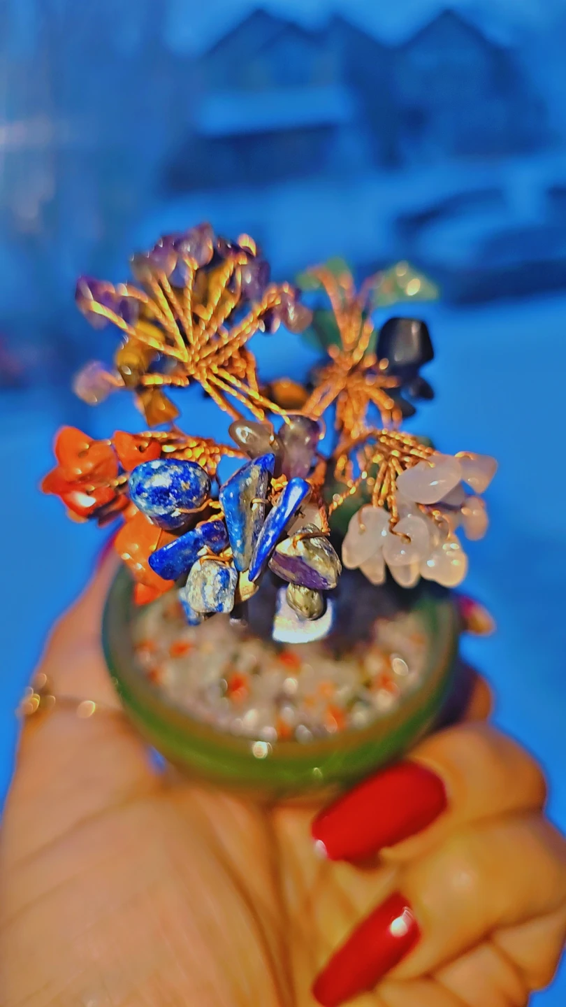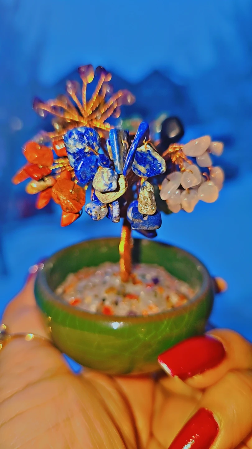 This is a beautiful crystal gemstone tree in a green pot. It's a lovely decorative piece for any room! It has lapis lazuli , green aventurine, Amethyst ,Red jasper , tiger eye , rose quartz &blk obsidian. 7 chakra tree .