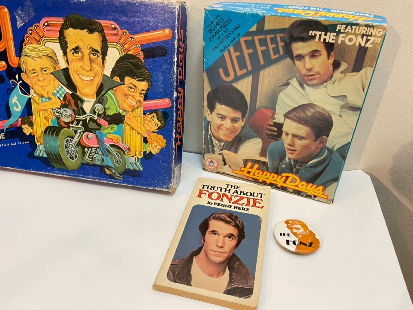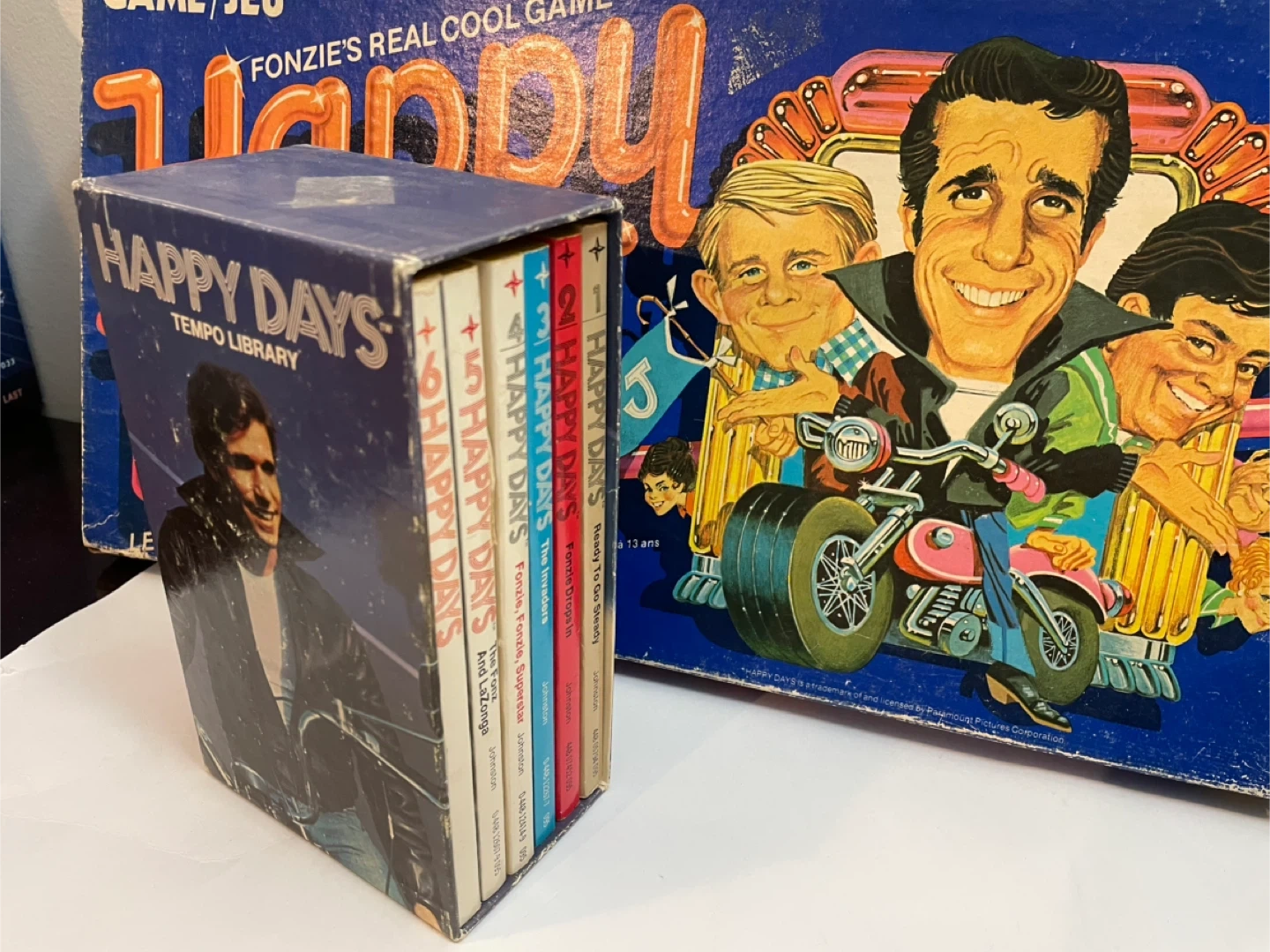 Vintage Happy Days board game by Parker Brothers, featuring Fonzies Real Cool Game. Includes the Tempo Library book set and 'The Truth About Fonzie' book. Great for fans of the classic show! Only 5$ each