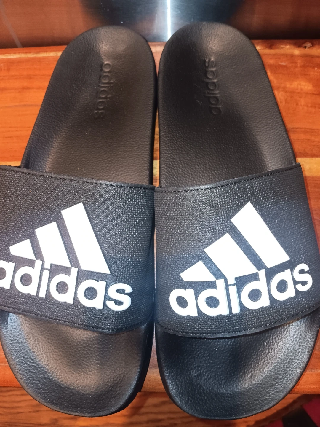 Black Adidas slides with Cloudfoam cushioning. Features the iconic Adidas logo on the strap. Size 10.