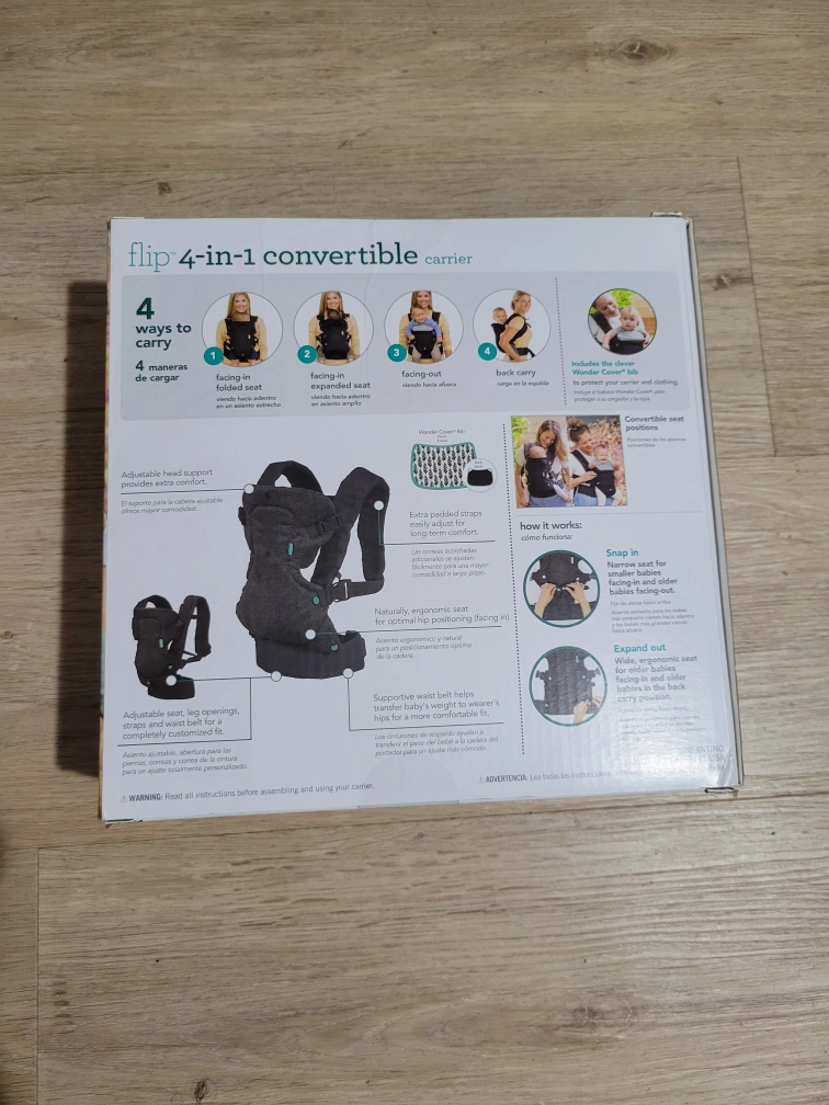 4 ways to carry: facing-in (narrow seat), facing-in (wide seat), facing-out and back pack