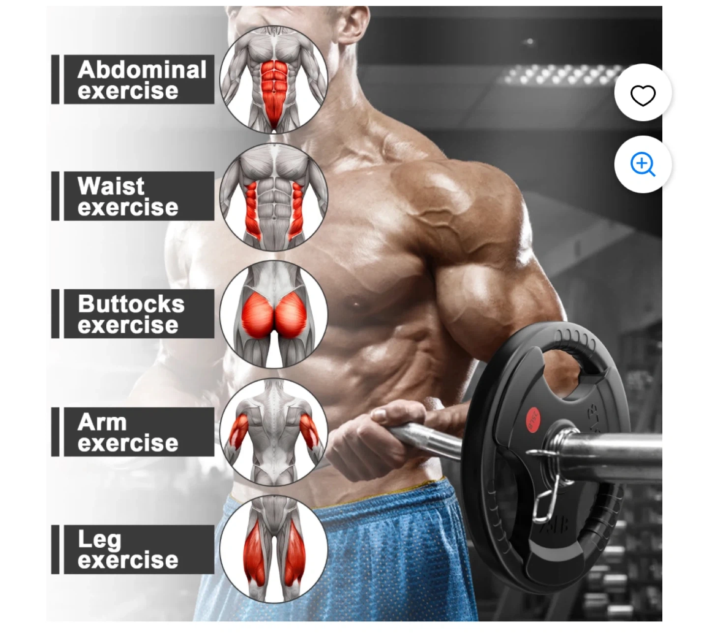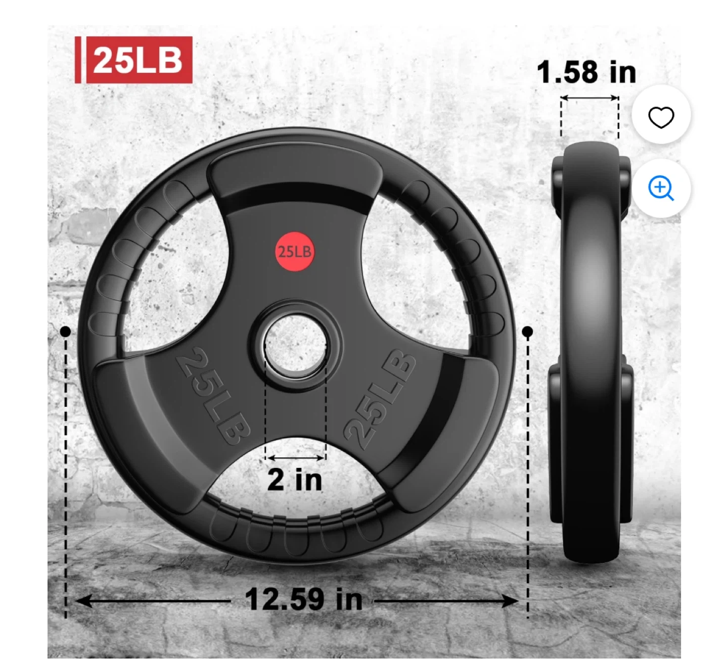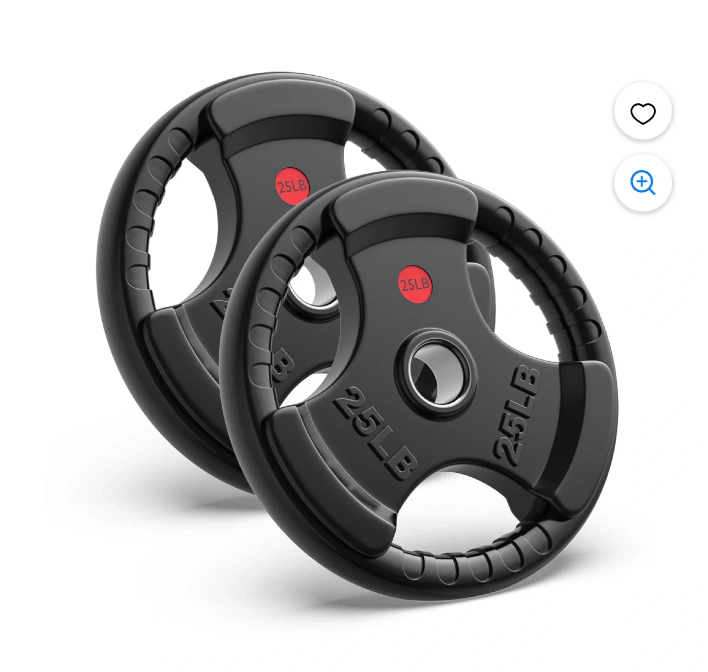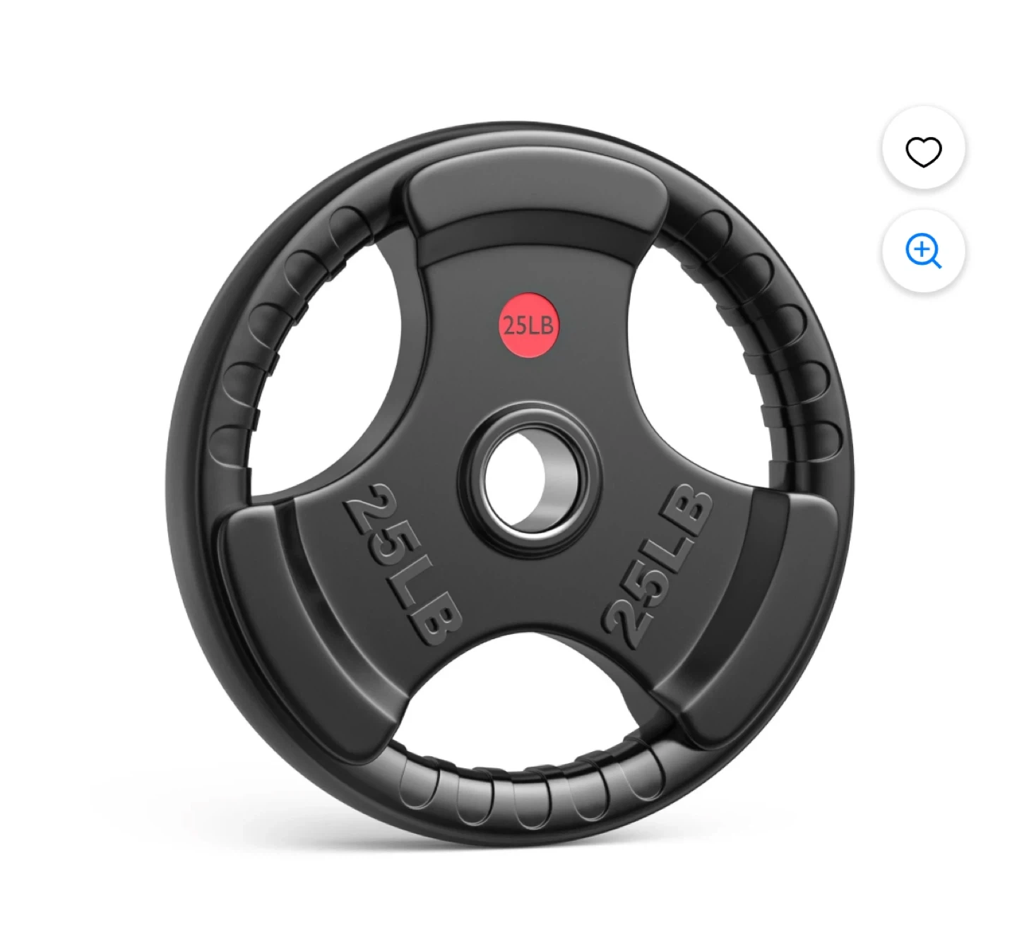 Top-of-the-line rubber coated Olympic grip plate weighing 25LB. It features a stainless steel ring with a 2" center hole fit for Olympic bars. The plate has 3 large opening grips for easy and secure handling.