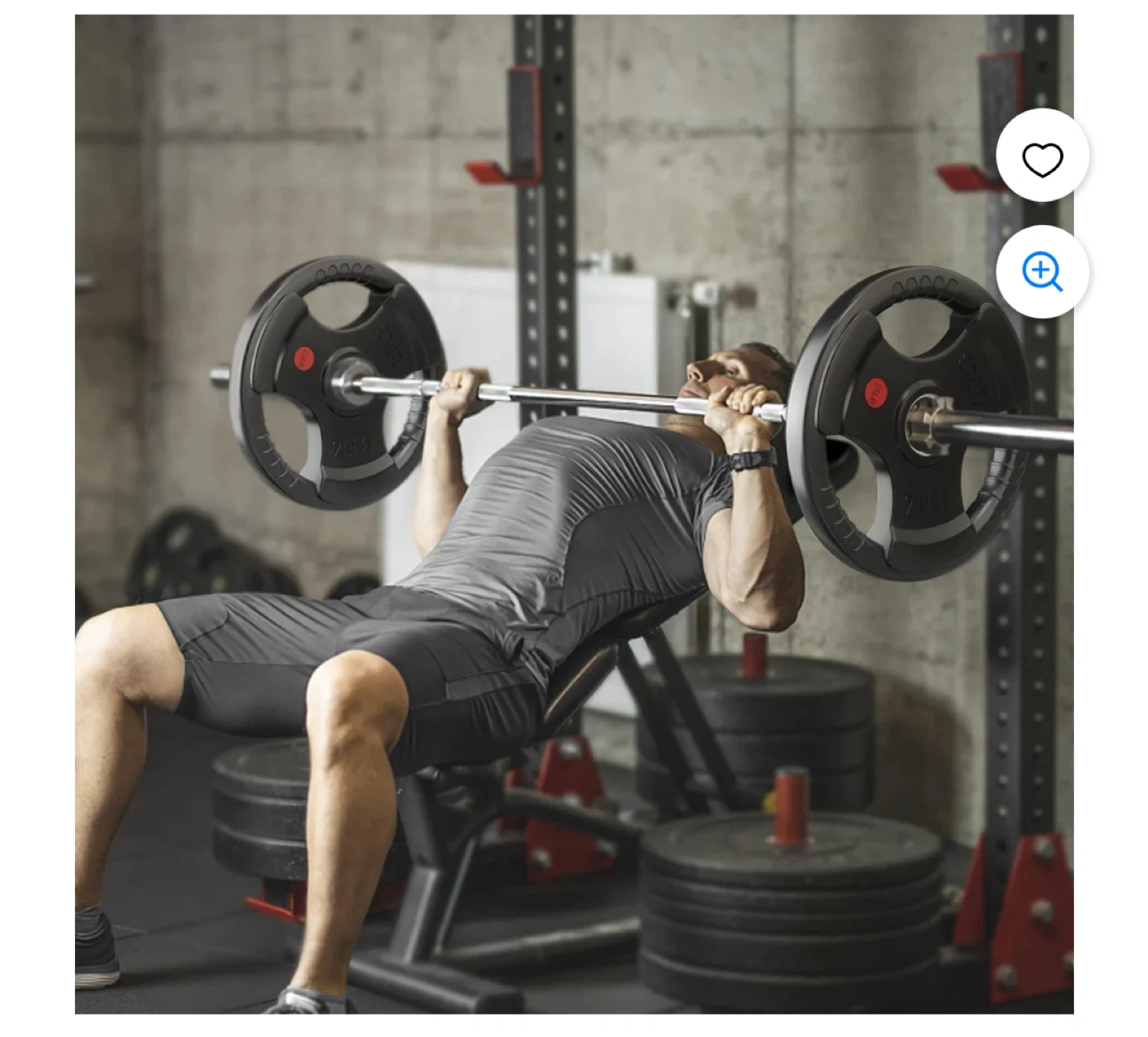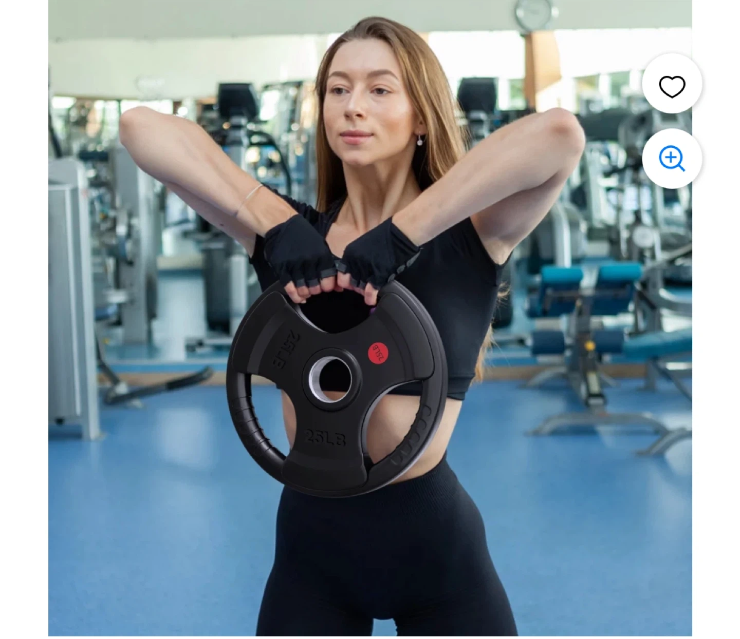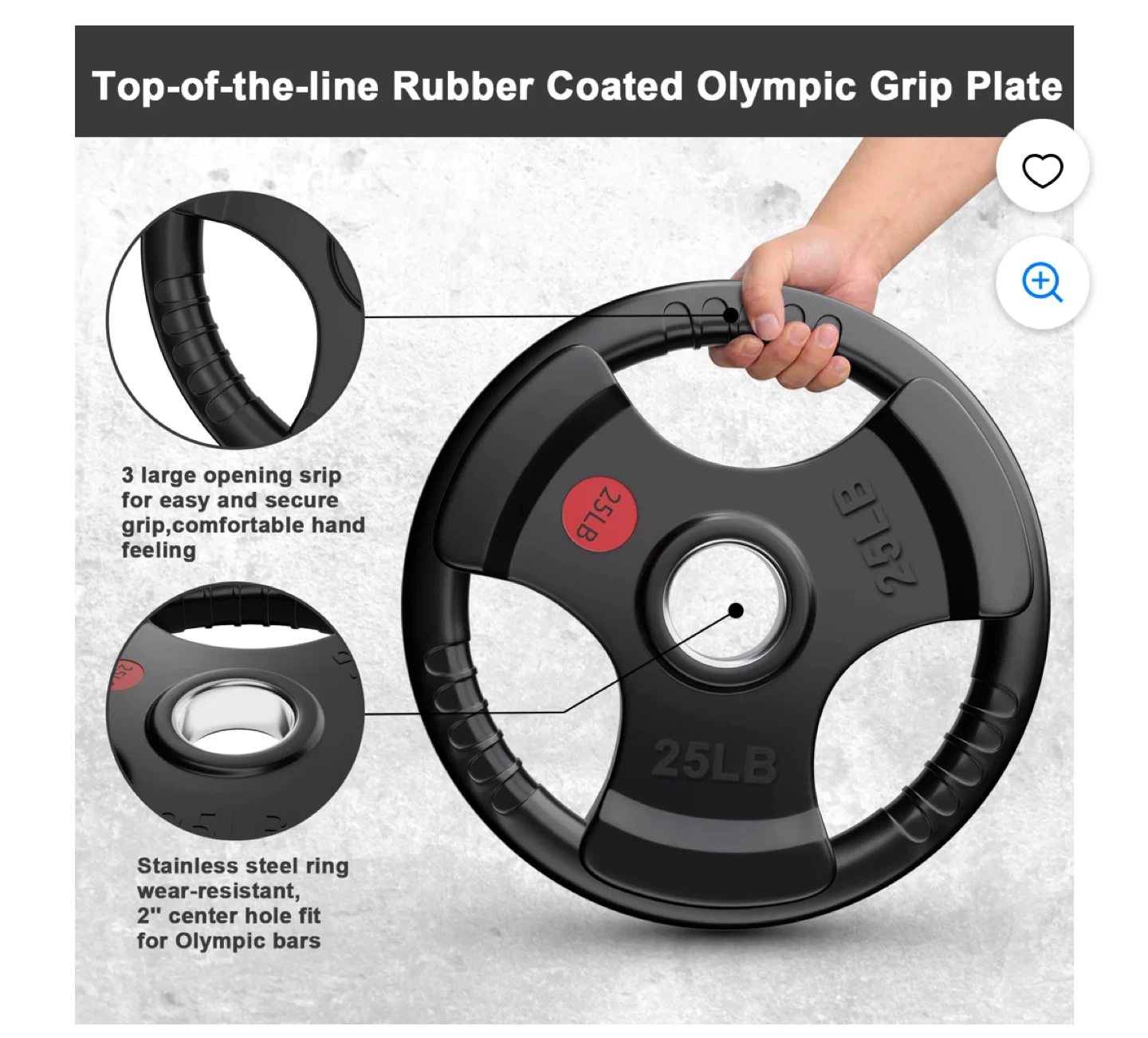 Top-of-the-line rubber coated Olympic grip plate weighing 25LB. It features a stainless steel ring with a 2" center hole fit for Olympic bars. The plate has 3 large opening grips for easy and secure handling.