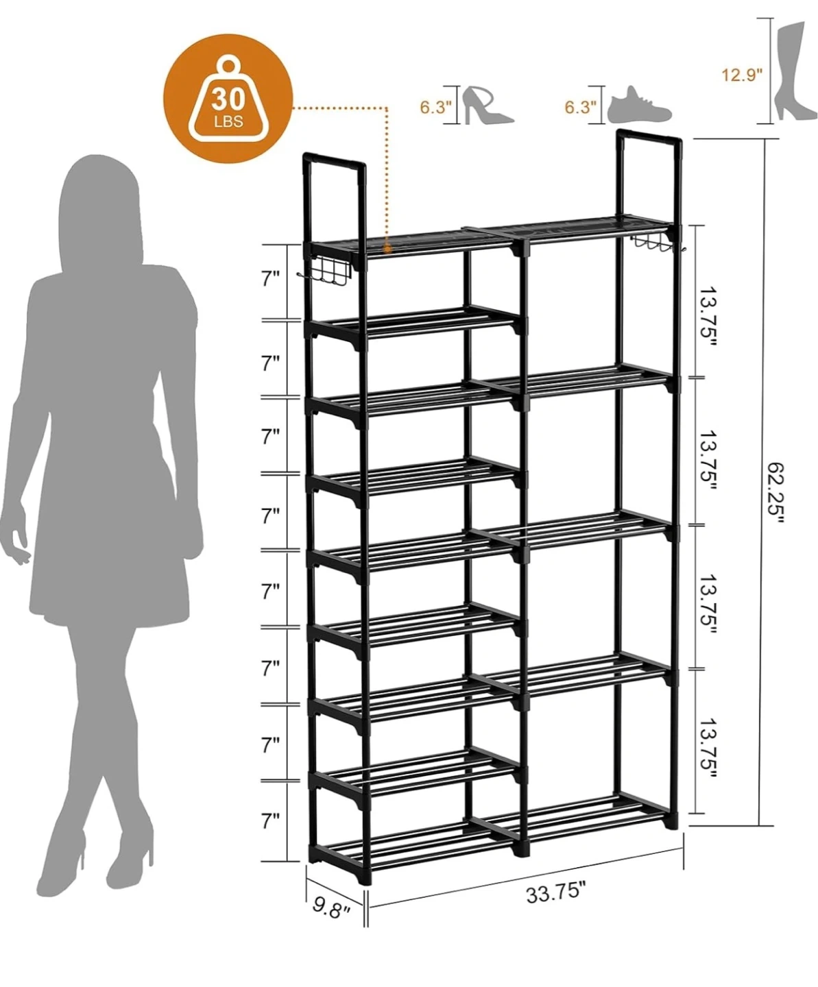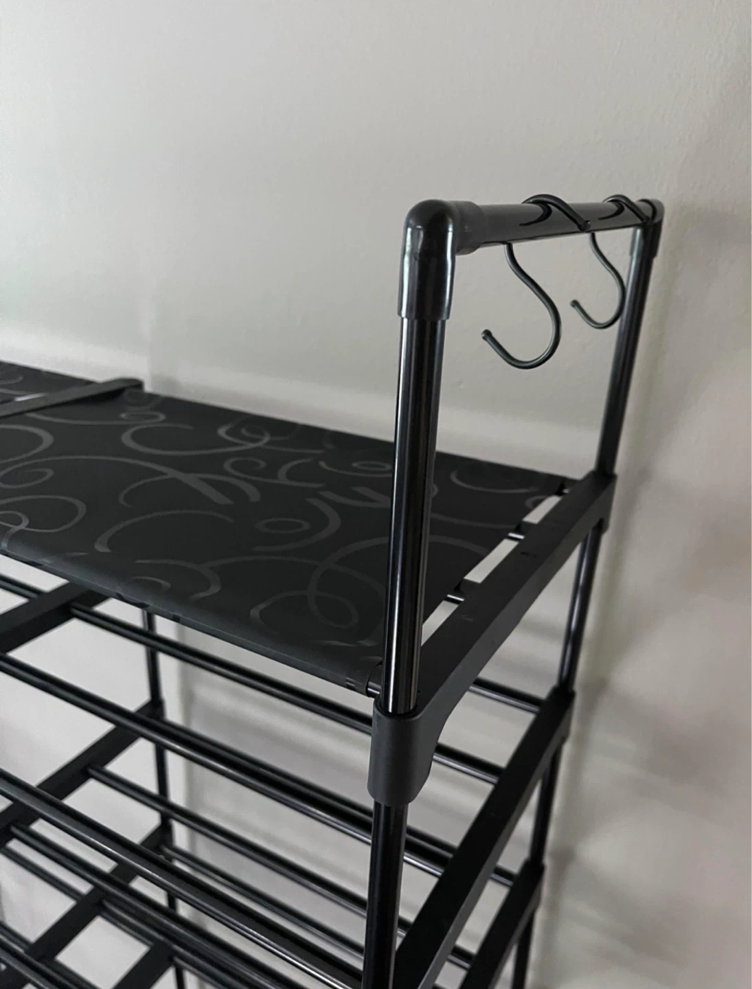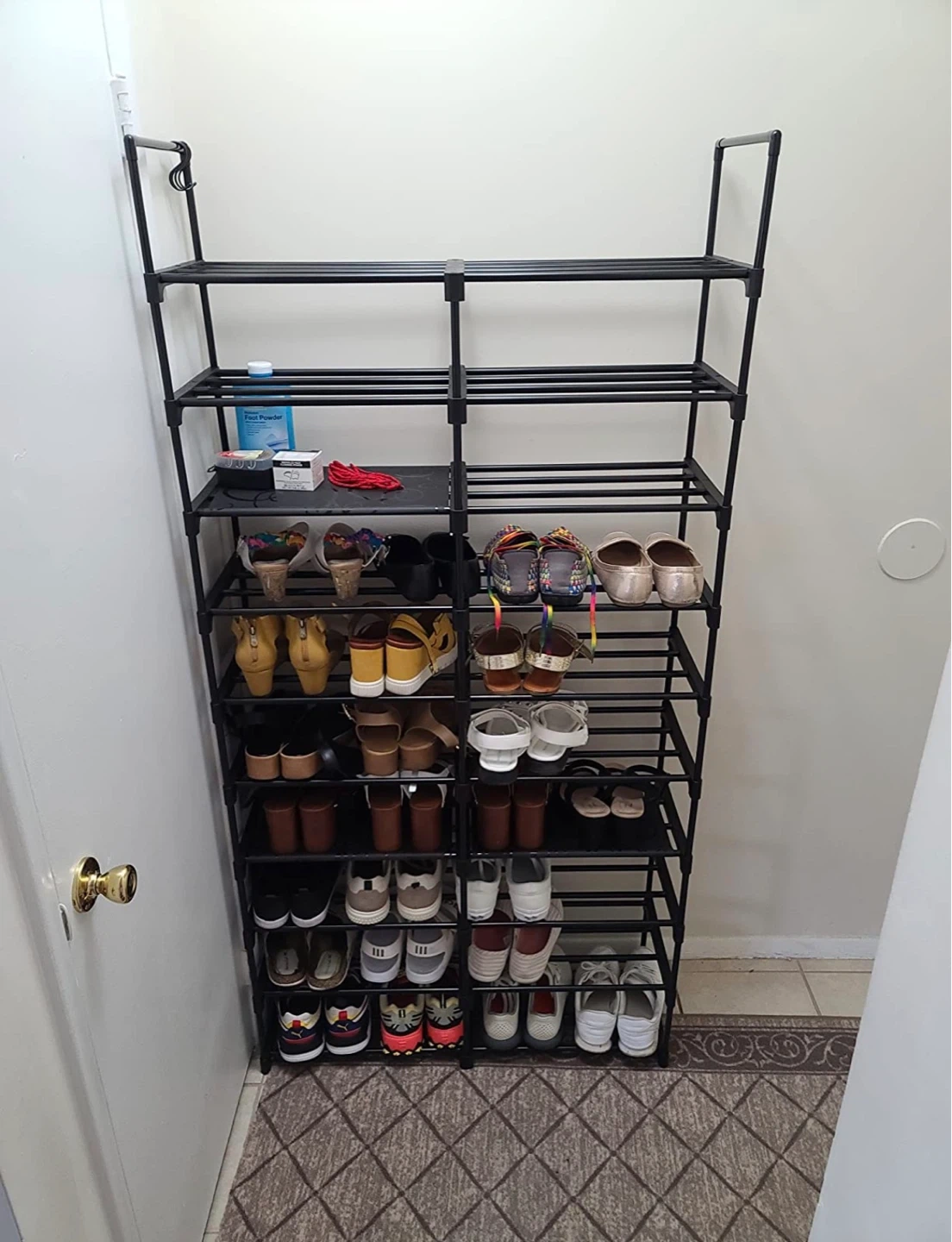 Shoe rack offers ample storage for your footwear collection. It's made of durable metal and fabric shelves. It can hold multiple pairs of shoes on each level!