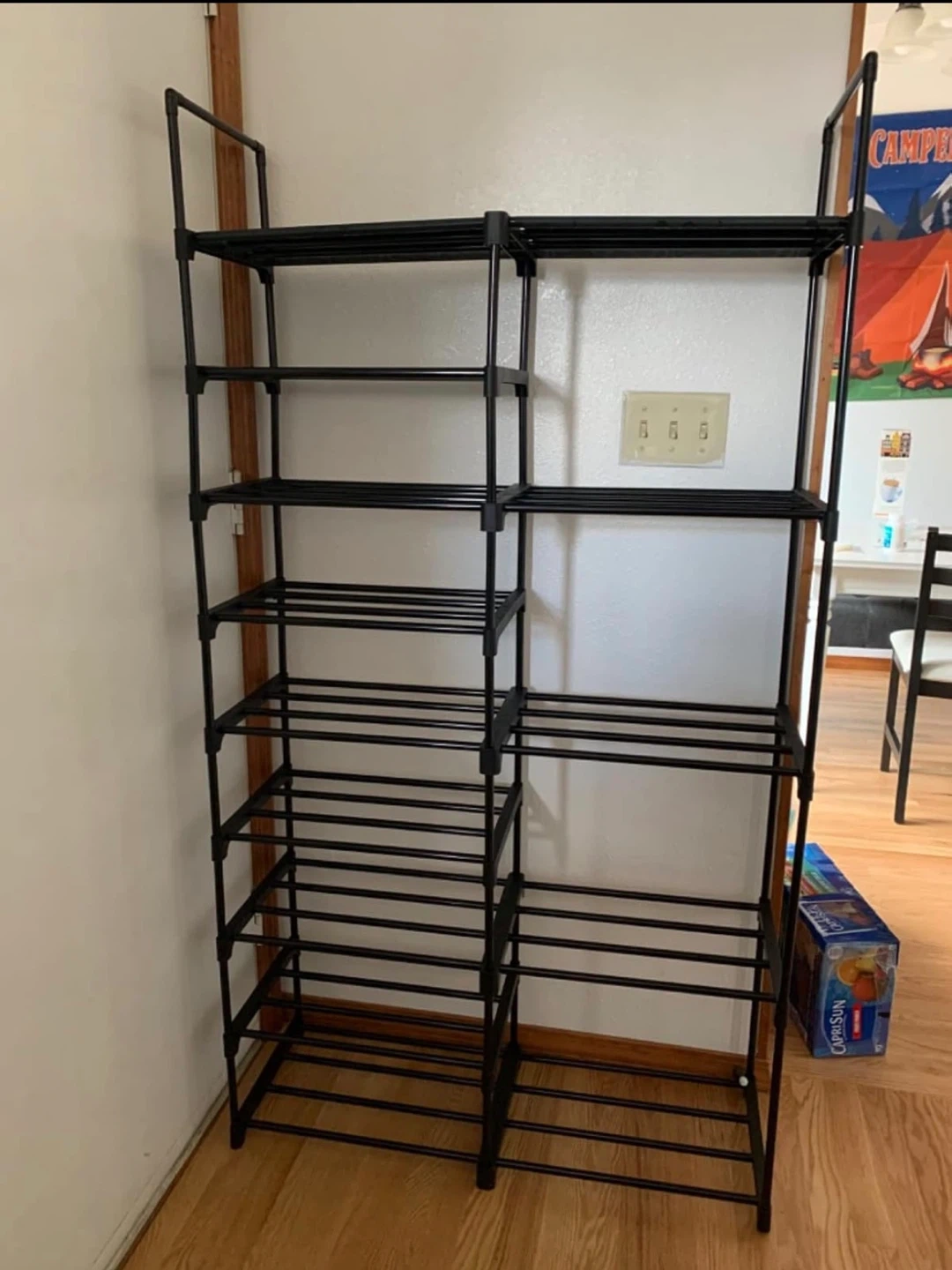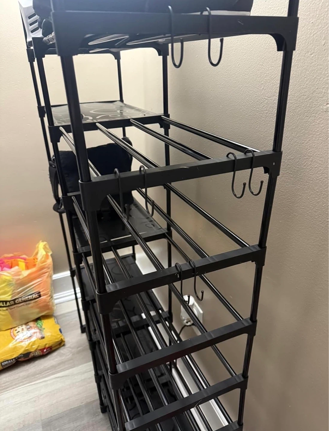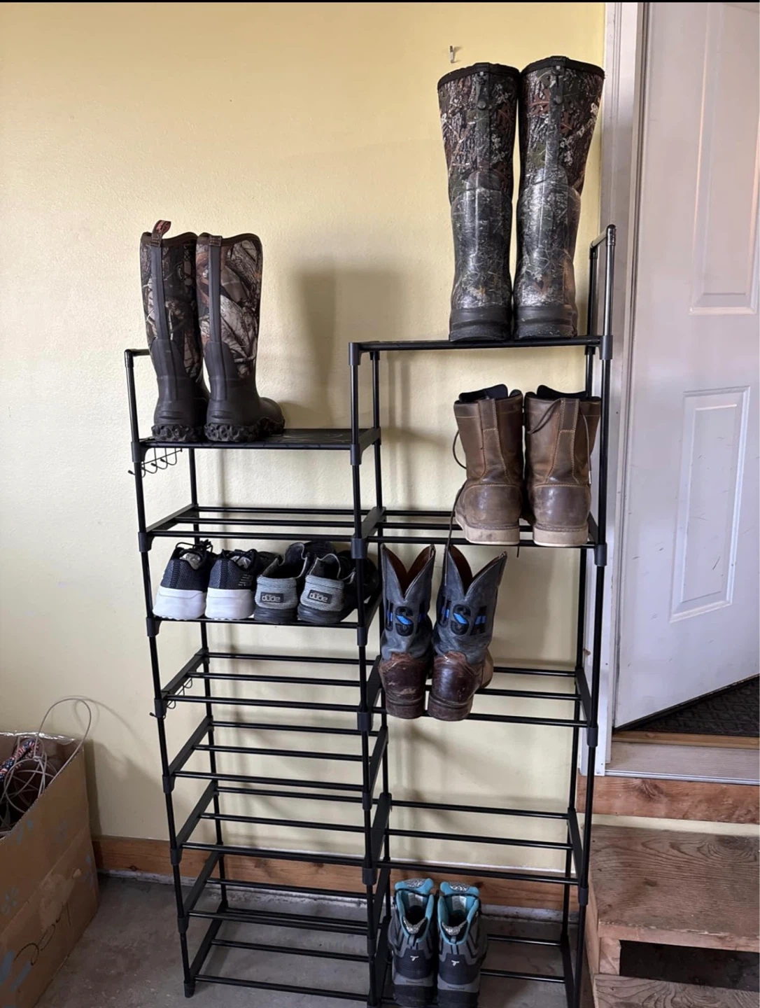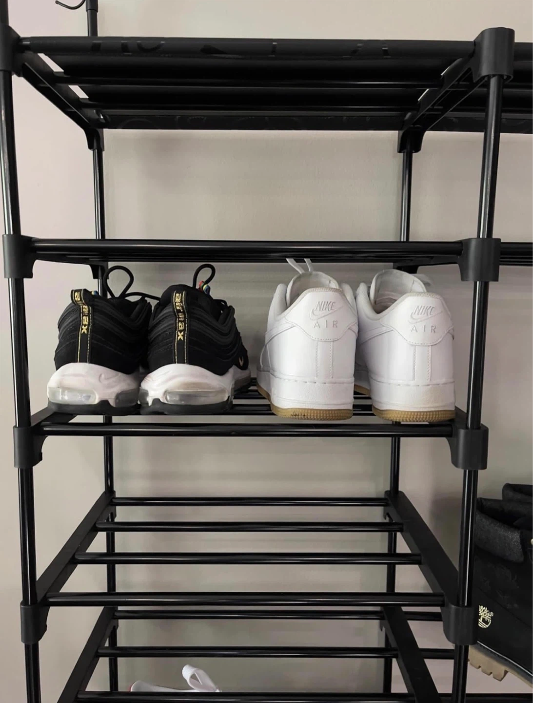 Shoe rack offers ample storage for your footwear collection. It's made of durable metal and fabric shelves. It can hold multiple pairs of shoes on each level!