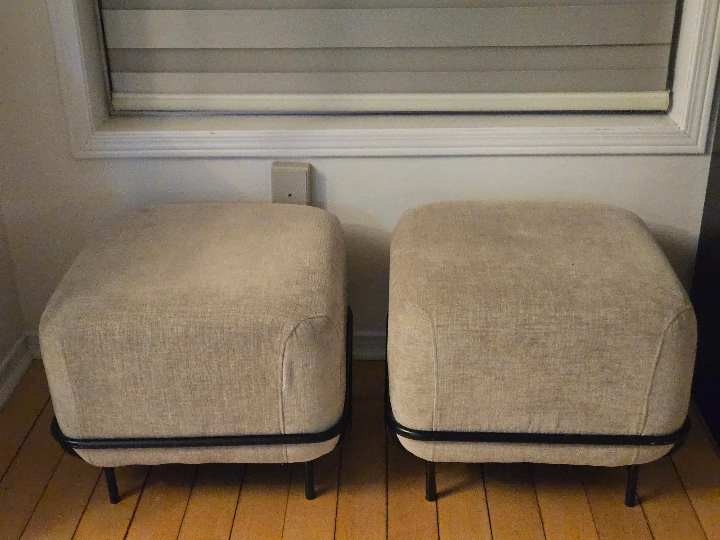 Selling a pair of beige upholstered ottomans. They have a fabric exterior and a metal frame with four legs. These could be used as footrests or extra seating. Only available as a pair! DM if you're interested!