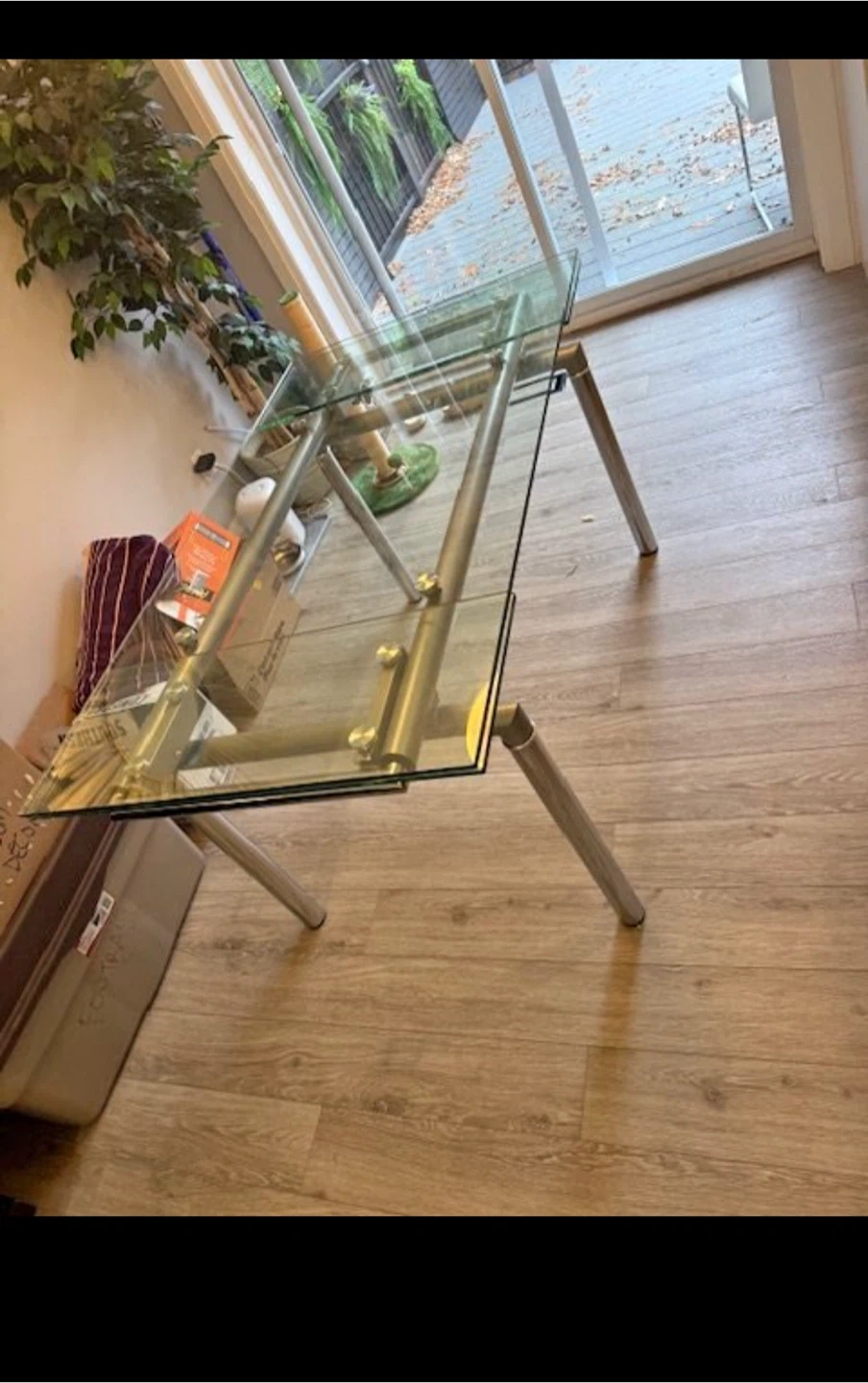 This is a stylish dining table with a clear glass top and a brushed metal frame. It's sturdy and modern, perfect for any dining space. The legs are made of silver-toned metal. Glass material.