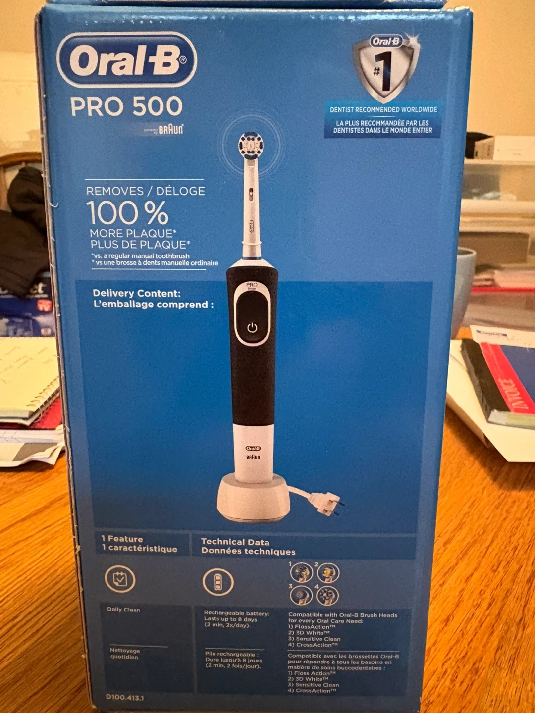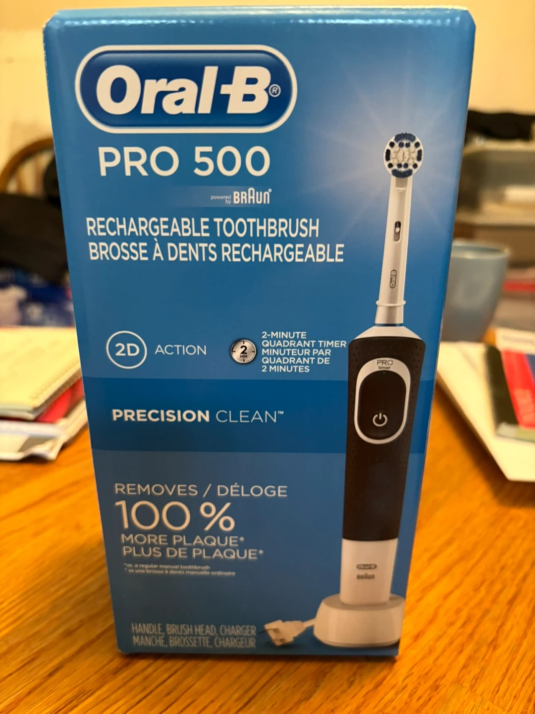 Selling a brand new Oral-B Pro 500 rechargeable toothbrush! It comes with the handle, brush head, and charger. The toothbrush features a 2-minute quadrant timer to help you brush effectively. It removes 100% more plaque compared to a regular manual toothbrush. Box included