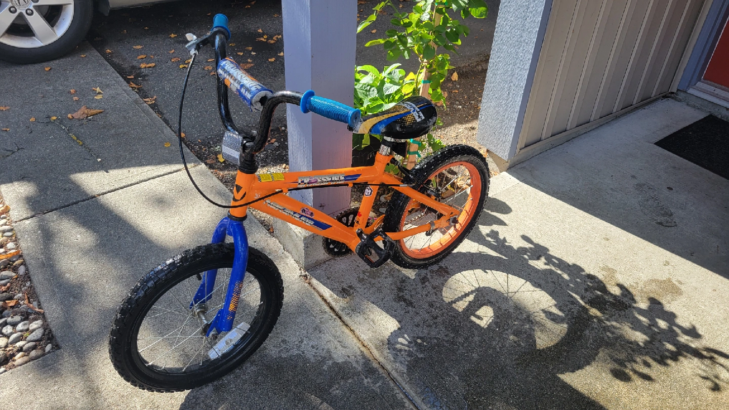 Selling a used kids' bike in orange and blue! It's perfect for learning to ride and having fun outdoors. The bike is in good condition and ready for a new home. Great for kids who are just starting to explore the world on two wheels