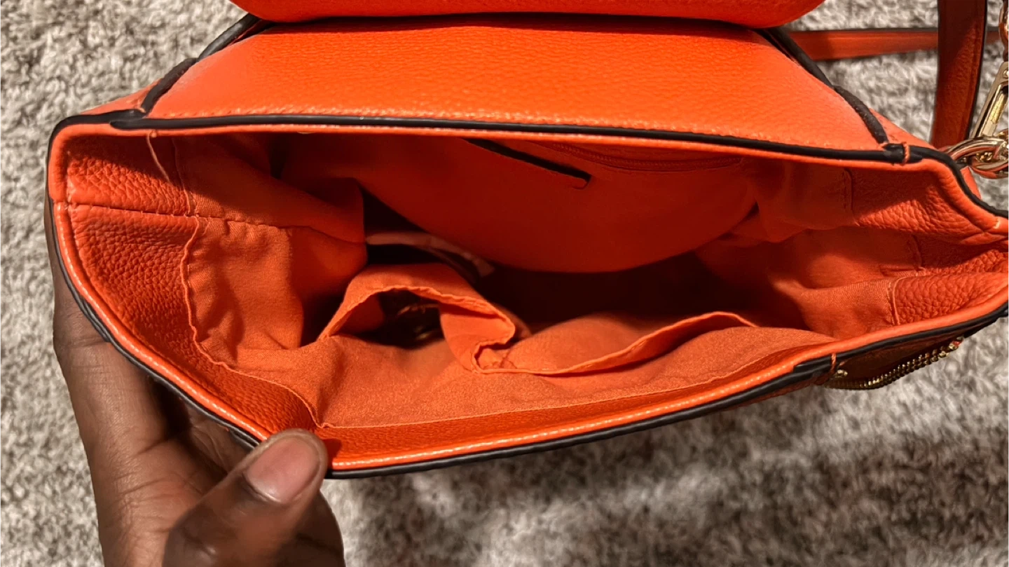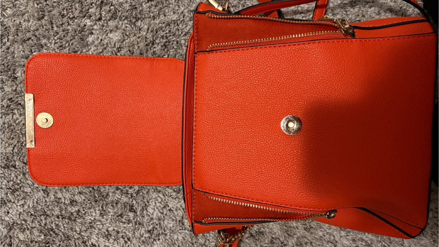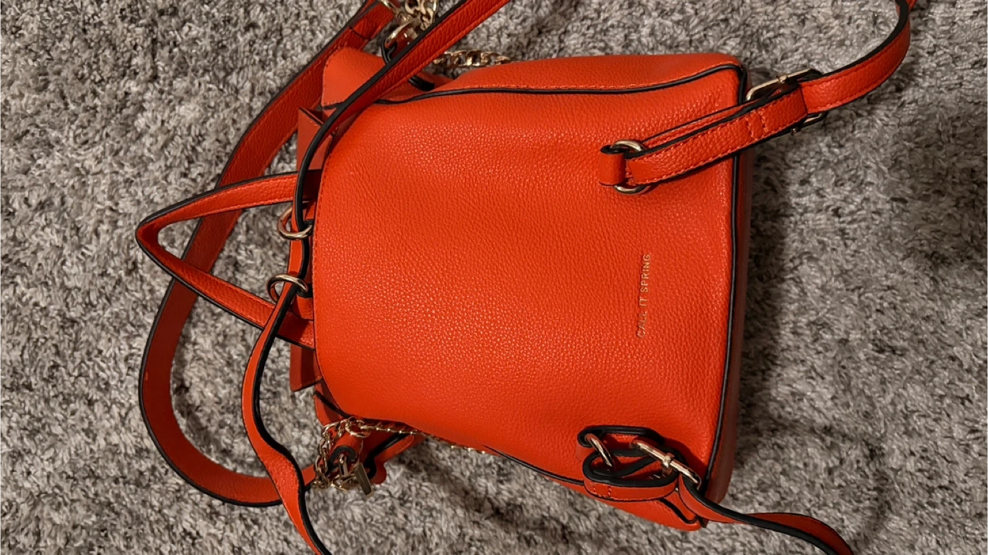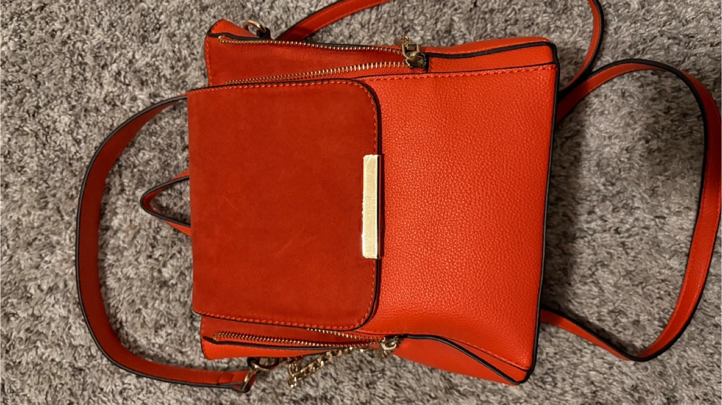 17Here's a cute orange backpack purse from It features a unique design with a suede-like material on the front pocket and gold-tone hardware. The interior has multiple pockets for organization. It's in great condition and ready for a new home