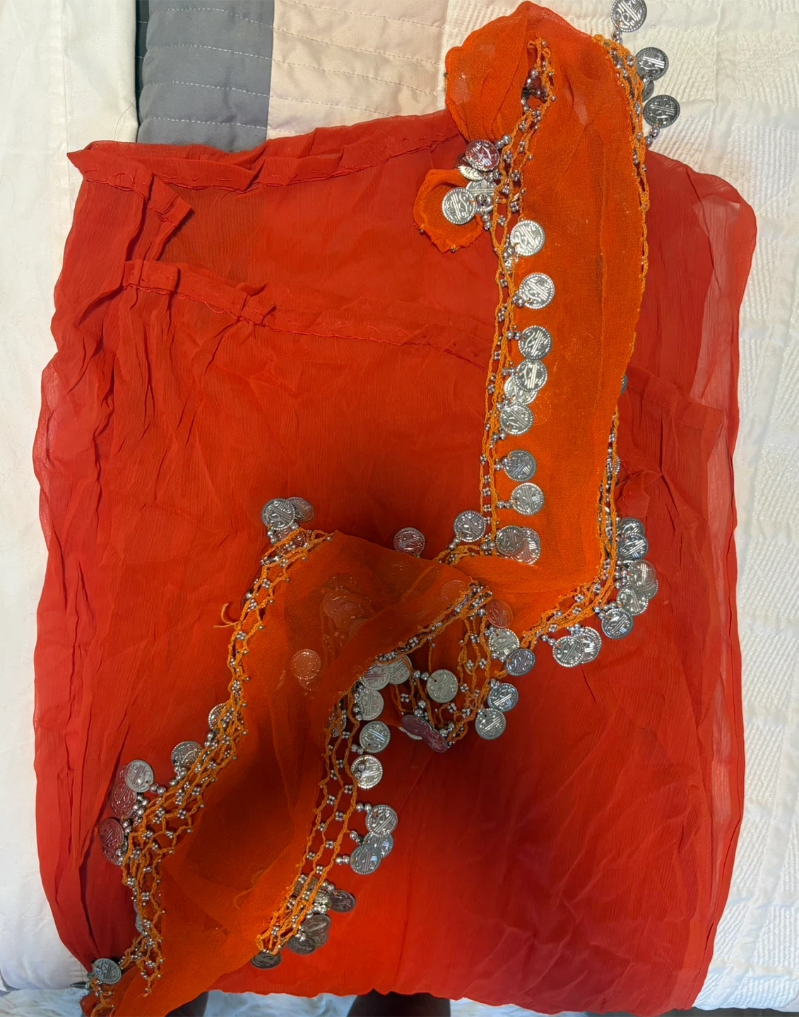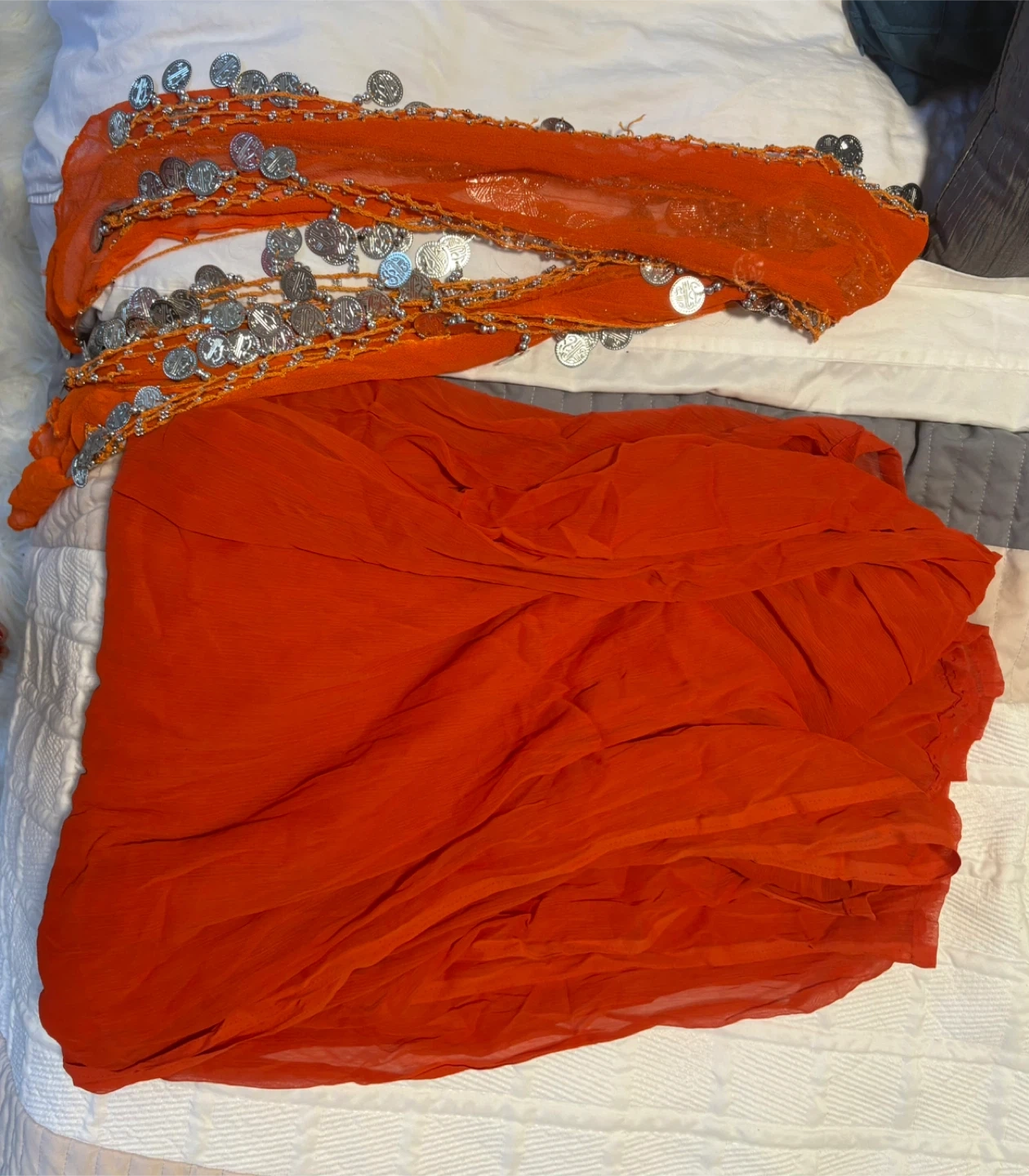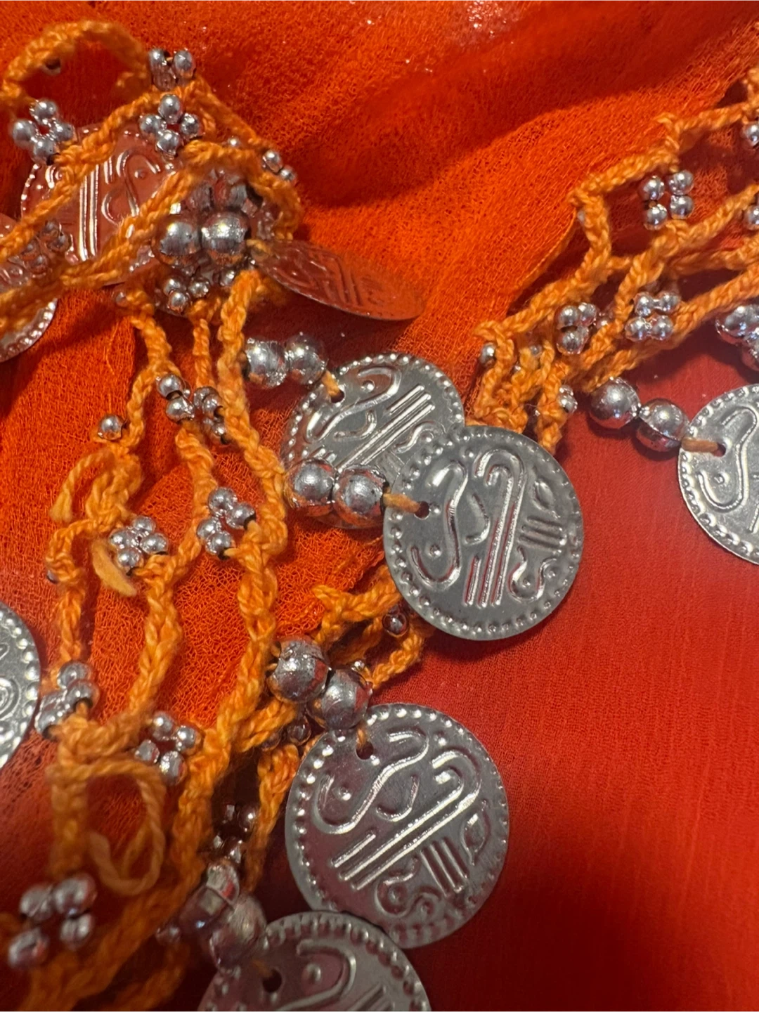 Selling a vibrant orange belly dance hip scarf! It features silver-coloured coins and beads. Perfect for adding some sparkle to your dance routine