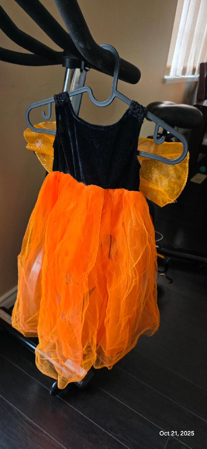 Cute orange and black dress, perfect for Halloween! It features a sparkly orange tulle skirt and a black velvet bodice. Great for a Halloween party or trick-or-treating