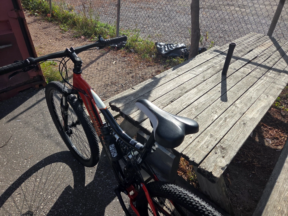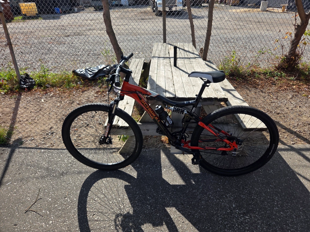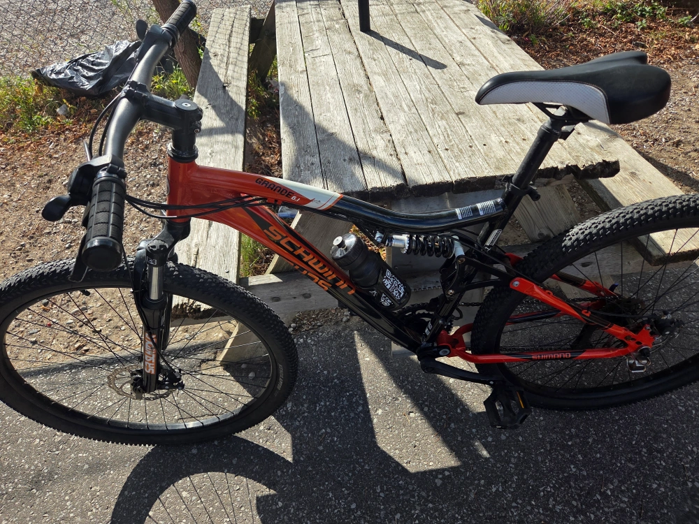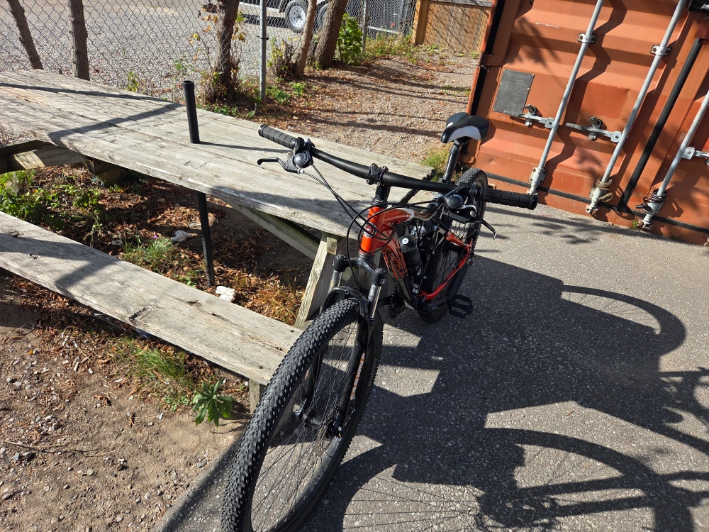 Selling a mountain bike with an orange and black frame. It looks like it's been used, but still has lots of life left in it! The tires are in good condition, and the seat is comfortable. Perfect for hitting the trails or just cruising around the neighbourhood