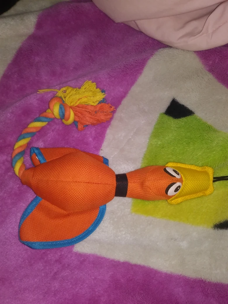 This is a fun, bright orange duck dog toy! It has a rope attached for extra play and tugging. It's in great condition and ready for a new furry friend to enjoy