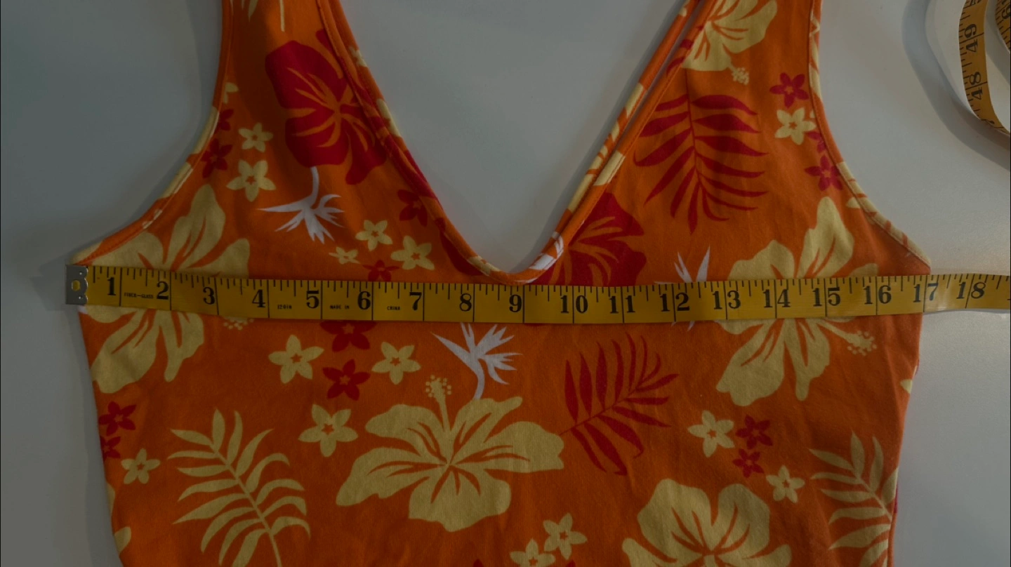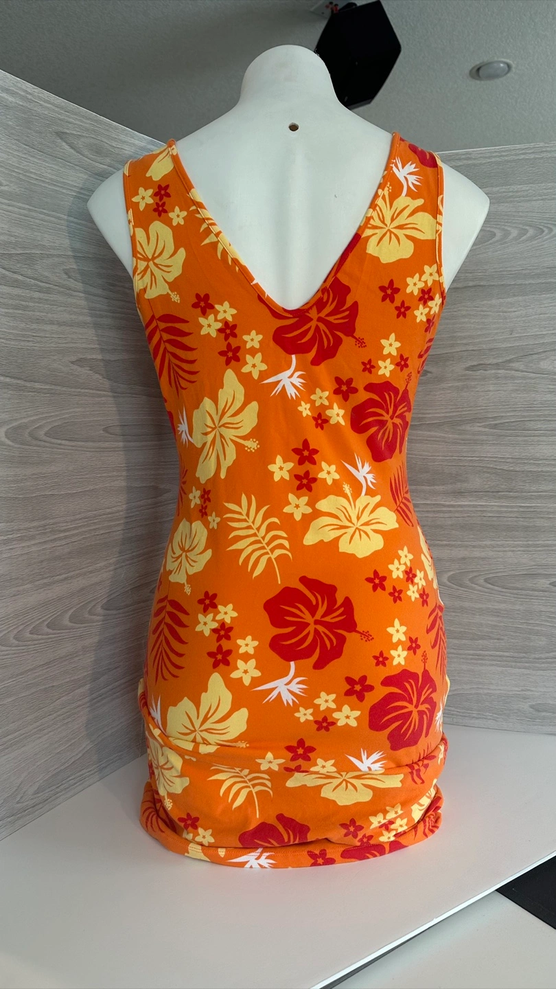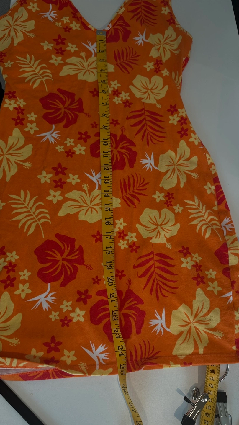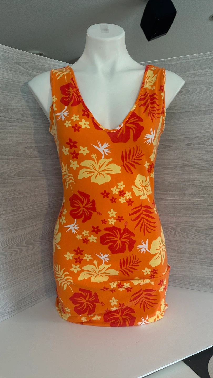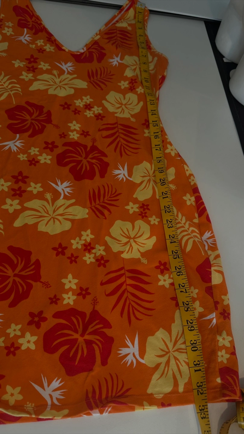 This vibrant orange tank dress features a cheerful floral pattern with red and yellow hibiscus flowers and green leaves. It's a size small and would be perfect for a sunny day out! The dress measures approximately 17 inches across the chest and 33 inches in length.