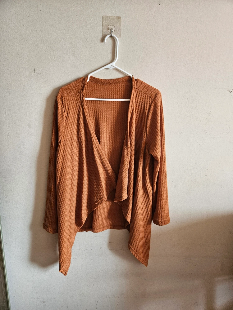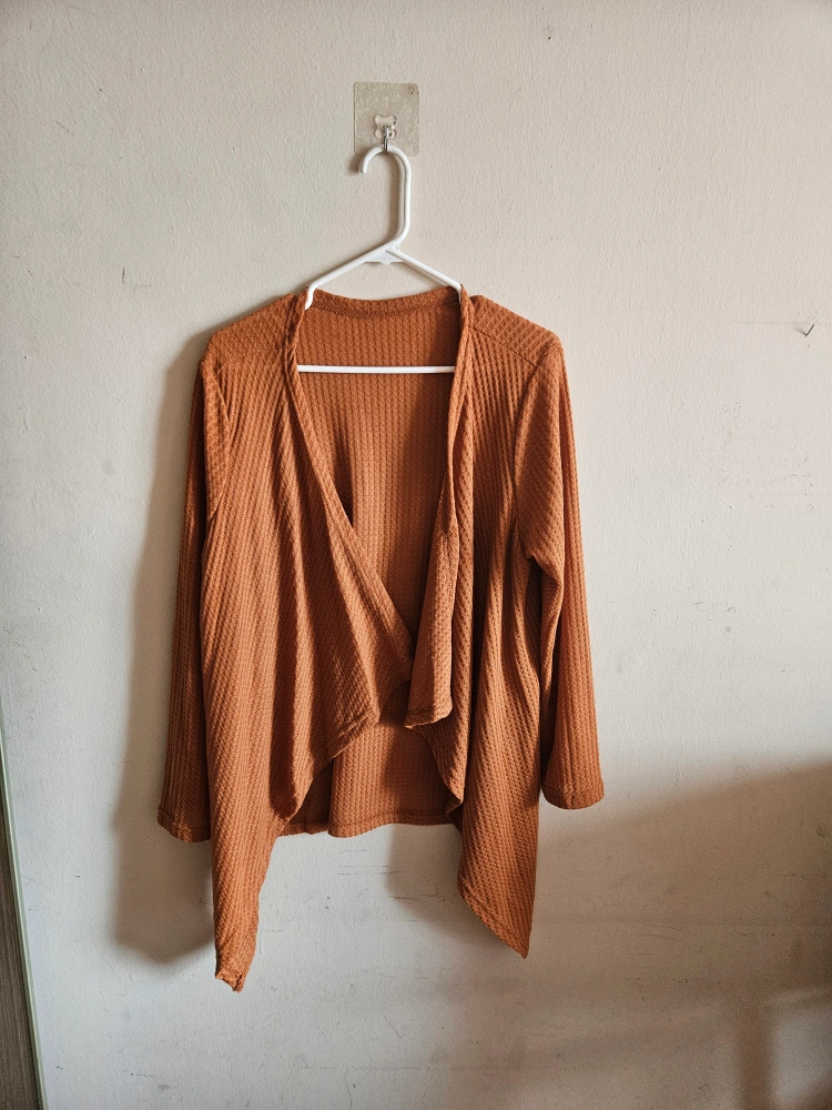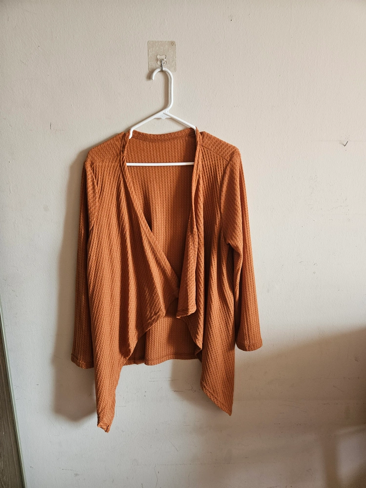 A cozy orange knit cardigan, perfect for layering! It's a comfy and stylish piece to add to your wardrobe. The material has a waffle-like texture.