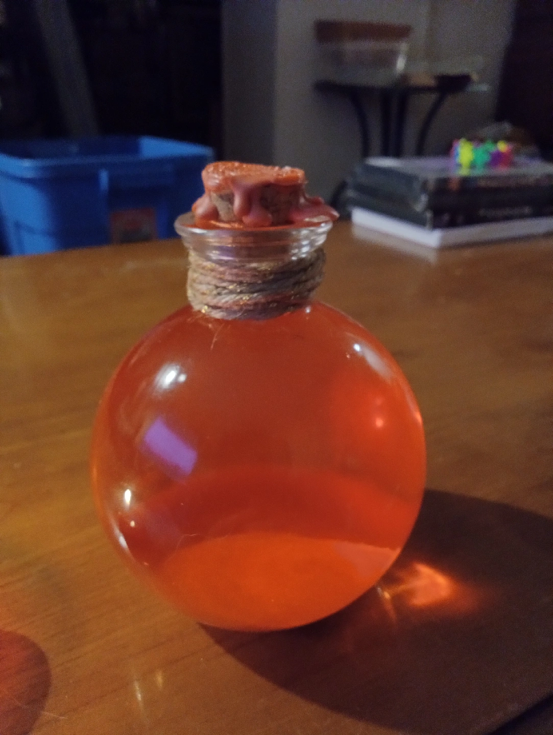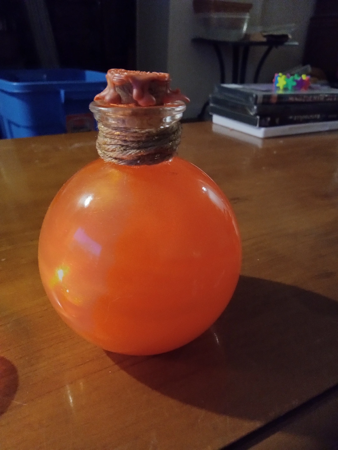 Selling a unique orange potion bottle! It's a round glass bottle filled with a shimmering, orange liquid, sealed with a cork and twine. Perfect for decoration or cosplay