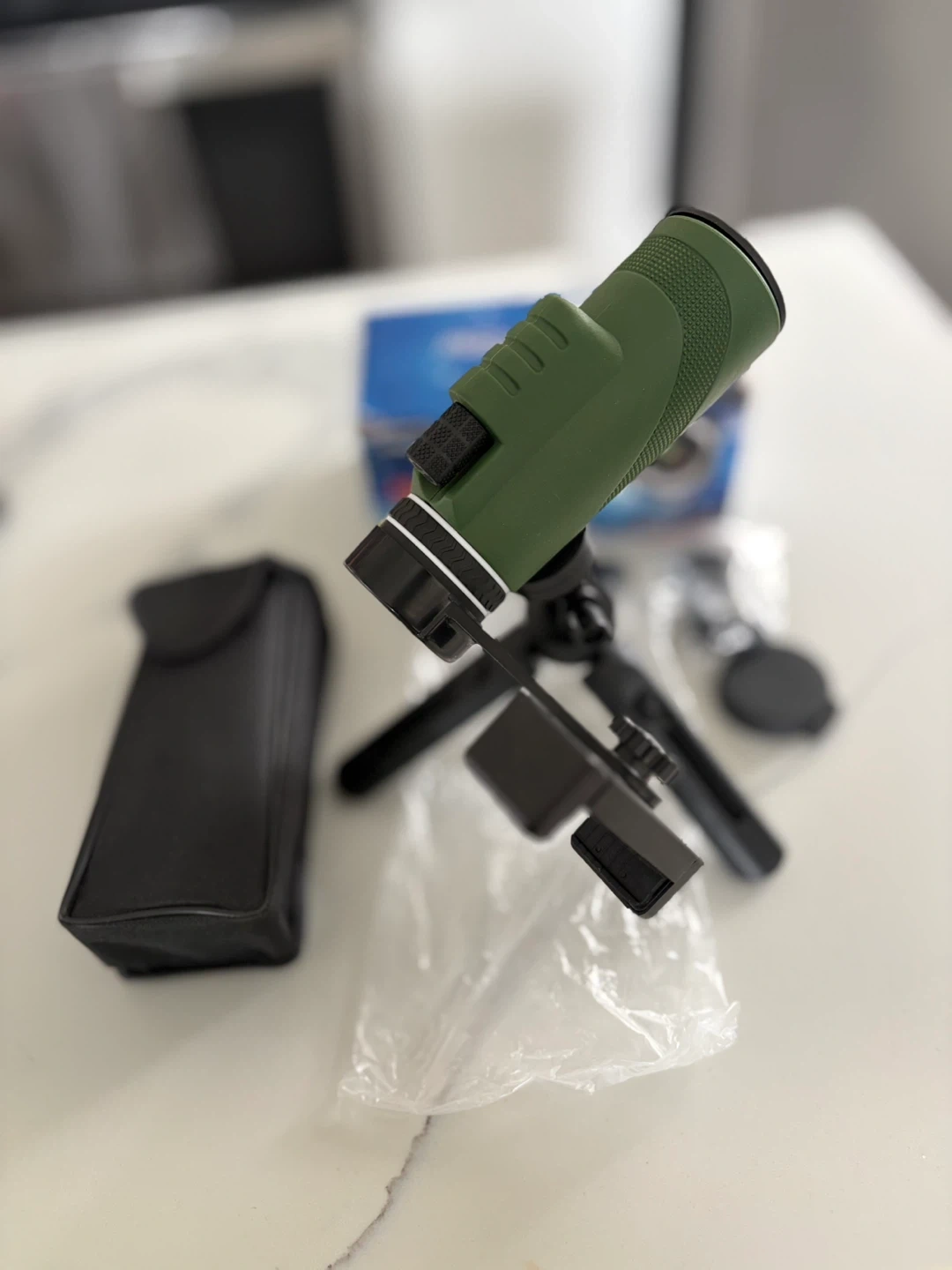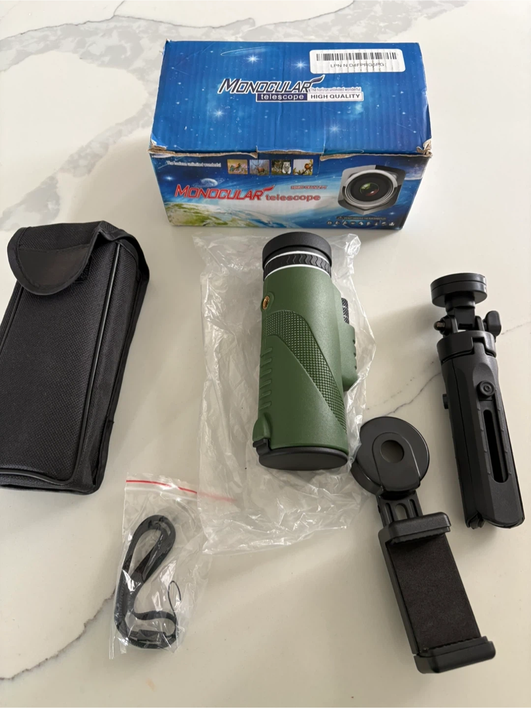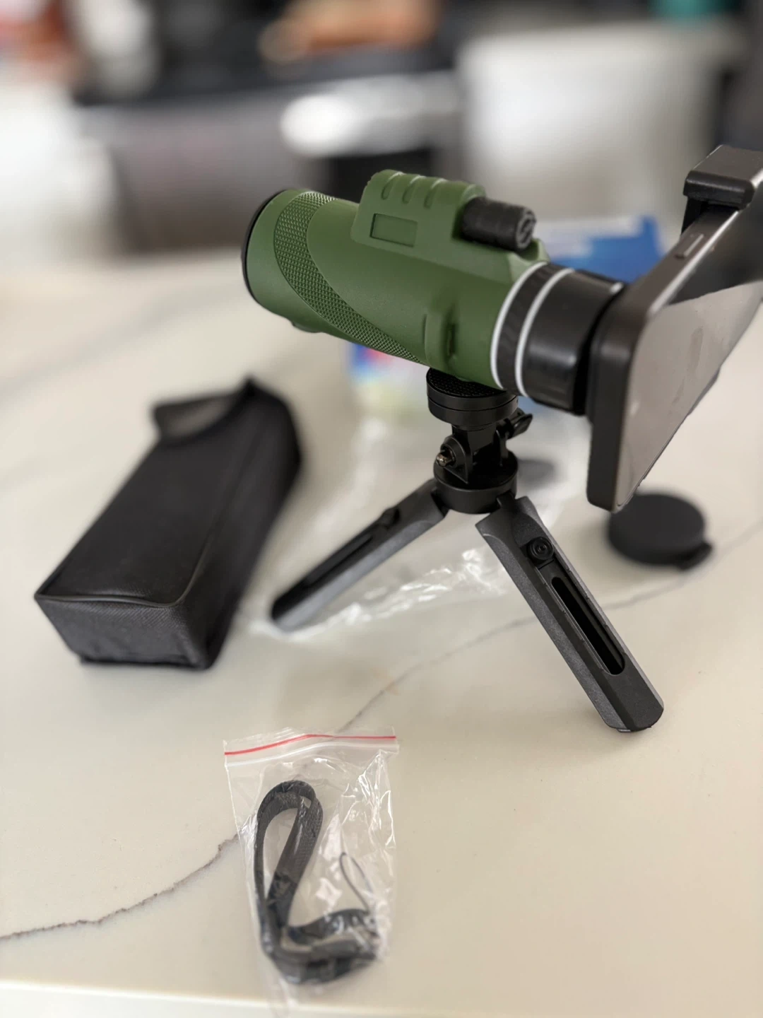 Green monocular telescope set that includes a carrying pouch, a small tripod, and a smartphone adapter. It's great for viewing distant objects. The adapter allows you to capture photos and videos through the telescope.
