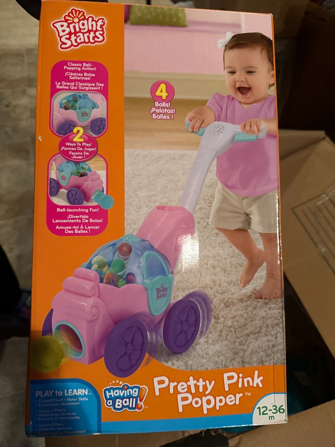 This Bright Starts "Having a Ball" Pretty Pink Popper toy is designed for classic ball-popping action and ball-launching fun. It encourages motor skills and cause-and-effect learning. It comes with 4 balls and is suitable for ages 12-36 months.