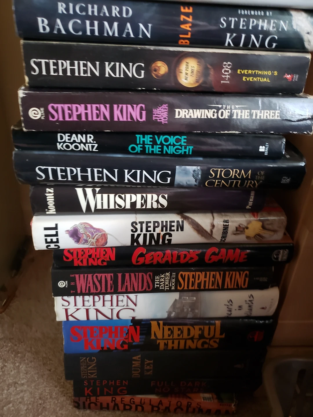 Buy & SellStephen King and Dean Koontz BooksStephen King and Dean Koontz Books$100lot of 36 Stephen King and Dean Koontz horror booksConditionGoodWHERE TO MEETRougeView MapSELLERverifiedKarenRouge843 reviews0 chats·0 favorites·30 viewsSEND CHAT TO SELLERHi Karen! I’m interested in your listing.Hi Karen! I’m interested in your listing.Get the Karrot app to chatSign In to chat