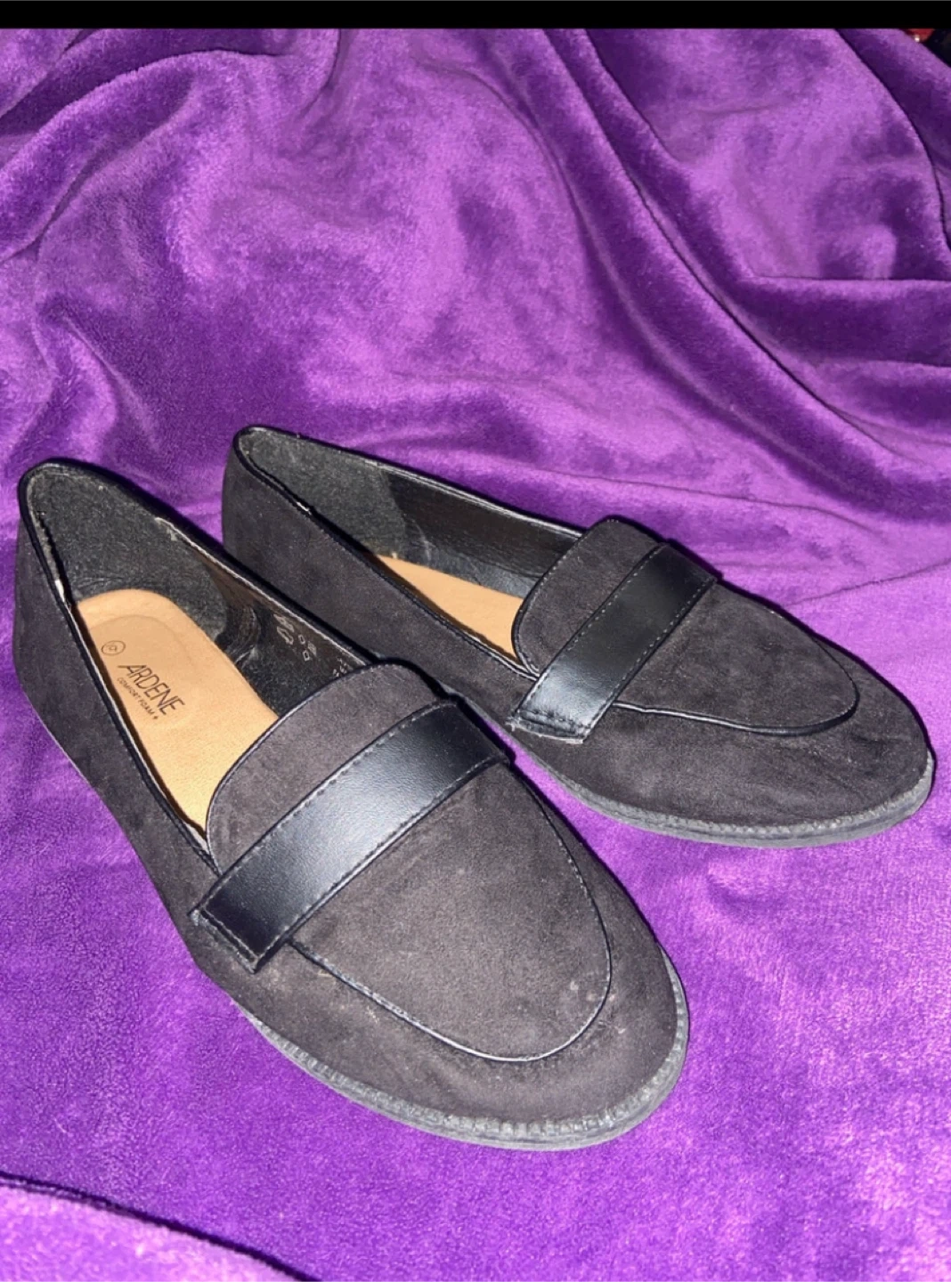 Step out in style with these gently worn Ardene black loafers, a classic and versatile addition to any wardrobe. These feature a sleek faux suede finish and a comfortable slip-on design, perfect for both casual and semi-formal occasions.