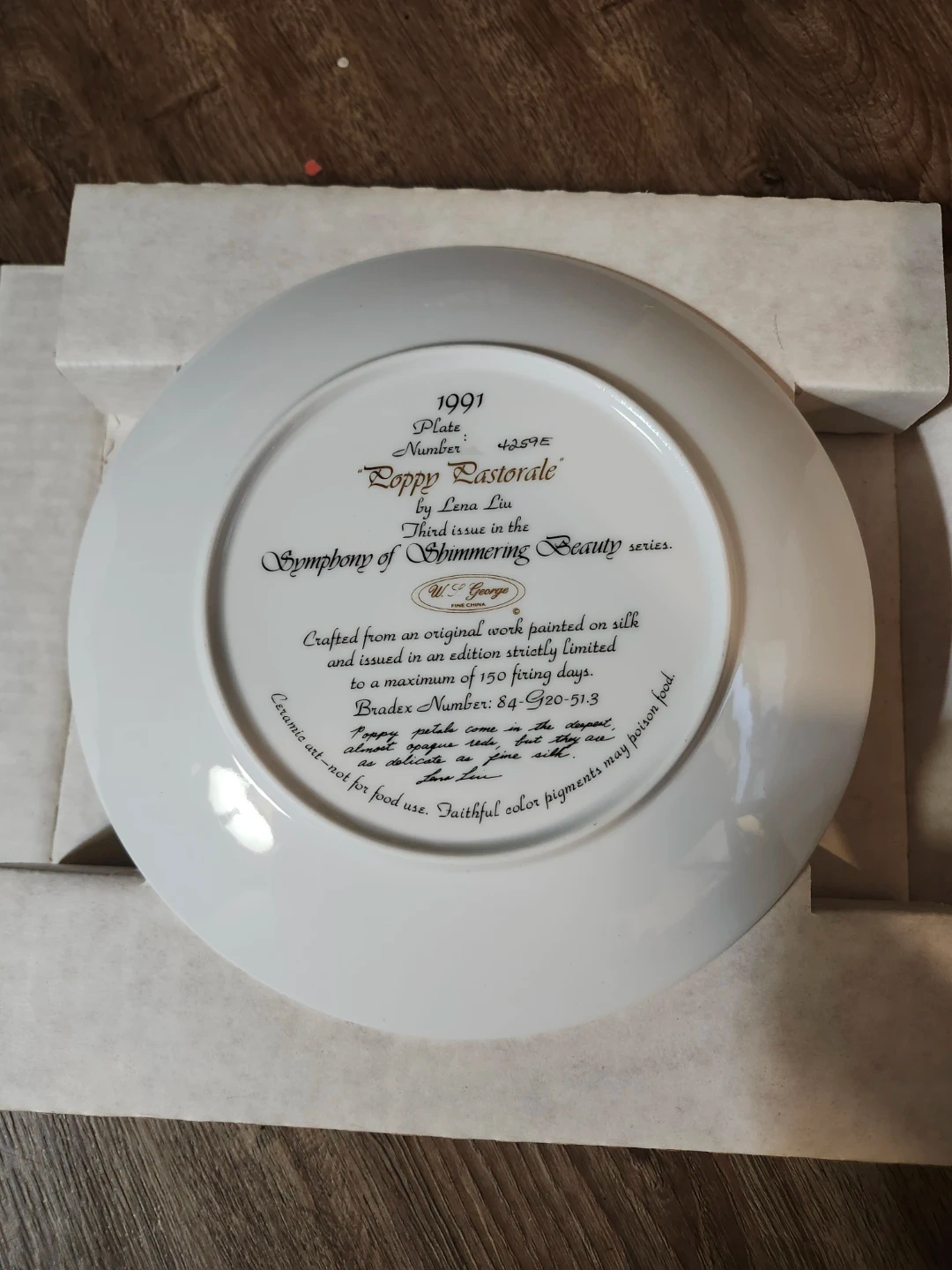 This is the third issue in the Symphony of Summering Beauty series, "Poppy Pastorale" collector plate by Lena Liu. Crafted from an original work, it's limited to an edition of 150 firing days. This decorative plate is not for food use.