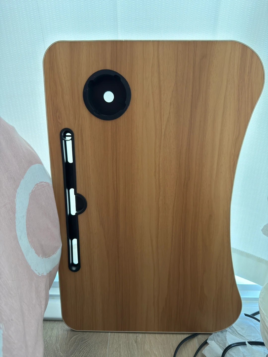 This portable lap desk features a wood-like finish and a built-in cup holder with a hole for cable management. It's designed for comfort and convenience when using your laptop on the bed or couch. The legs fold for easy storage.