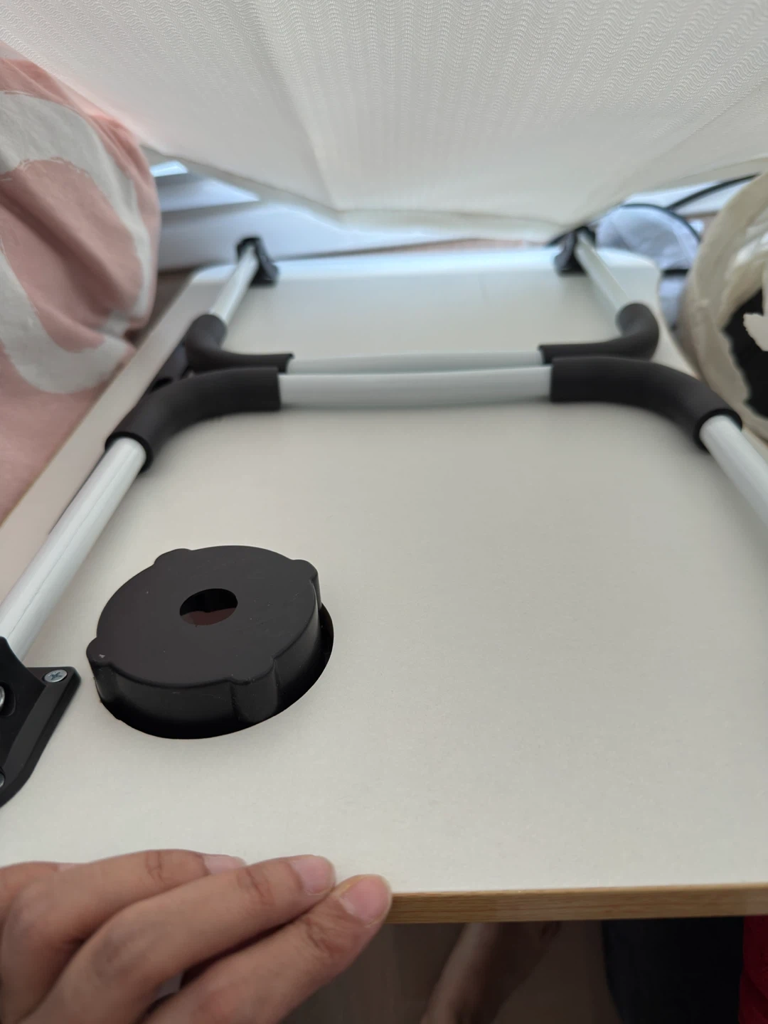 This portable lap desk features a wood-like finish and a built-in cup holder with a hole for cable management. It's designed for comfort and convenience when using your laptop on the bed or couch. The legs fold for easy storage.