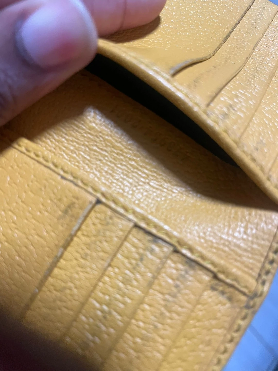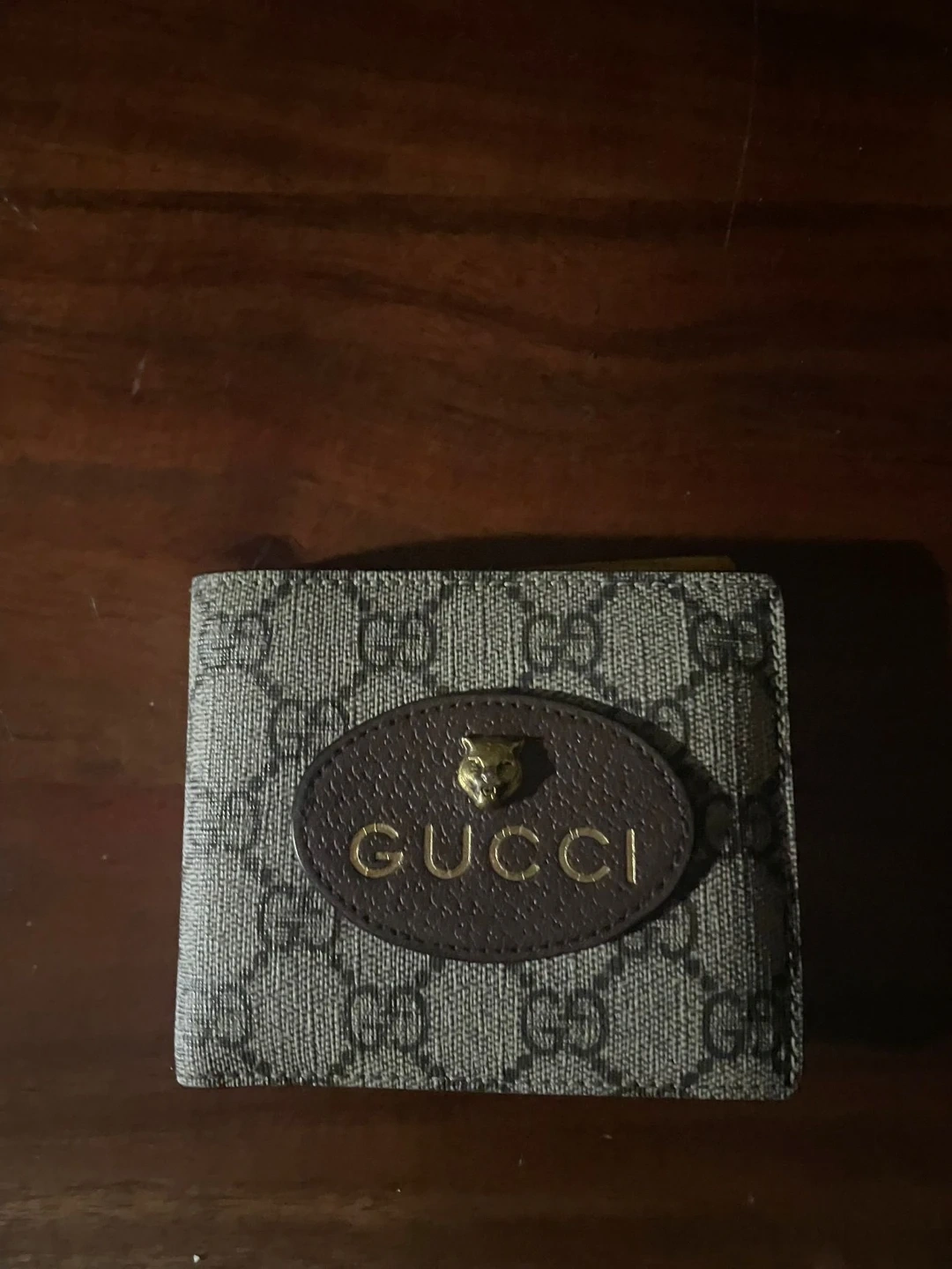 This is a GUCCI GG Supreme bi-fold wallet. It features the iconic GG pattern and a brown leather oval with a tiger head emblem. Interior has multiple card slots and a bill compartment.