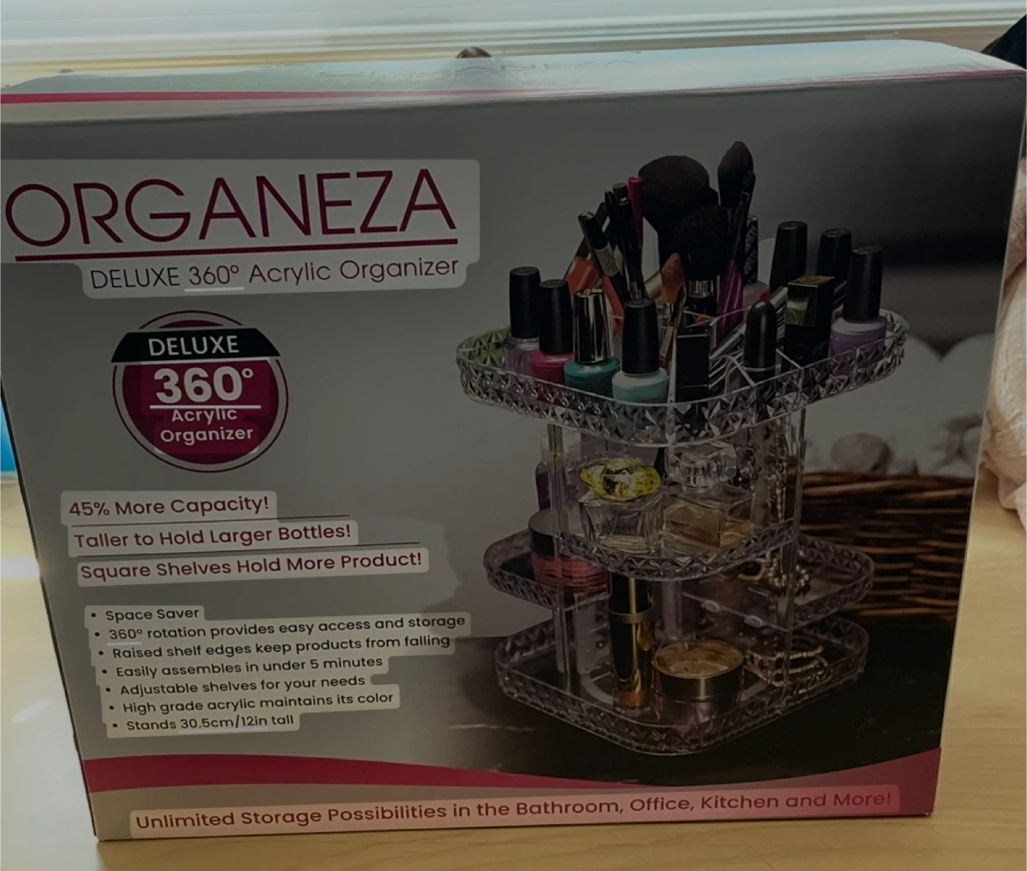 18Declutter your space with this Organeza Deluxe 360° Acrylic Organizer! It's a space saver with 360° rotation for easy access and storage. The raised shelf edges keep your products from falling. It easily assembles in under 5 minutes and has adjustable shelves for your needs. It stands 30.5cm/12in tall and has unlimited storage possibilities in the bathroom, office, kitchen and more!