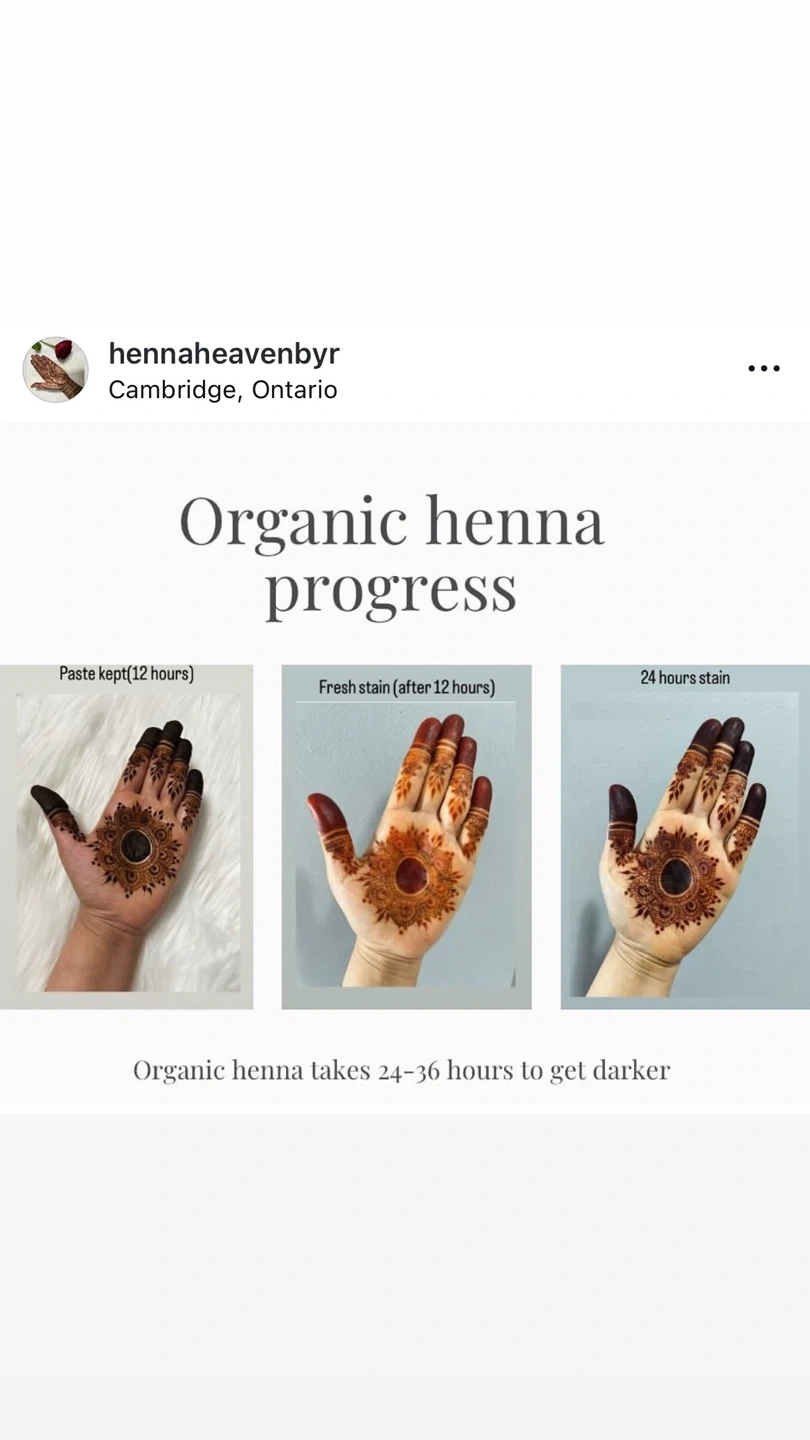 10Organic henna progress shown in three stages: paste kept (12 hours), fresh stain (after 12 hours), and 24 hours stain. Organic henna takes 24-36 hours to get darker