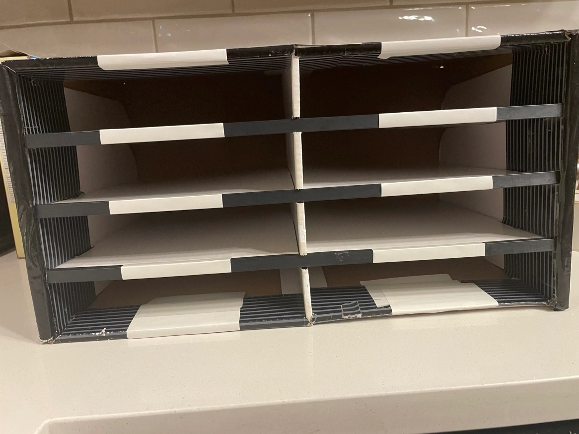 Paper sorter, organizer. Includes 8 compartments with corrugated divider system with high strength frame Includes plastic finishing channels and self-adhesive labels for easy file identification Fits Letter-size files 10.25"H x 19.5"W x 12.38"D This paper organizer is stylish with Black and white striped storage. Great for mail, forms, invoices, sheets or any letter size literature