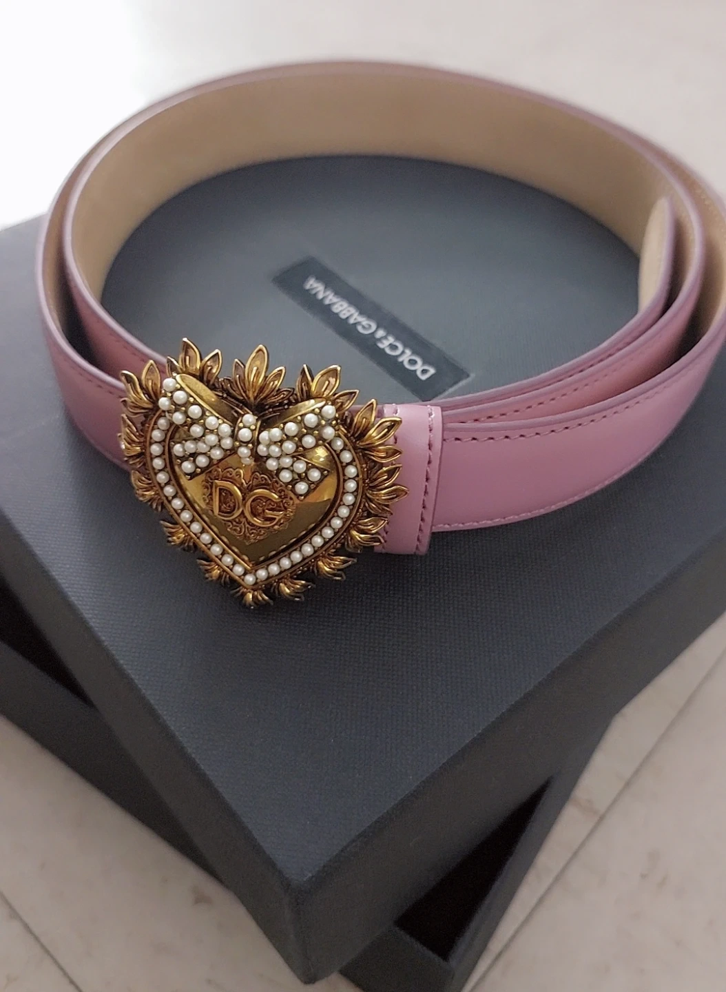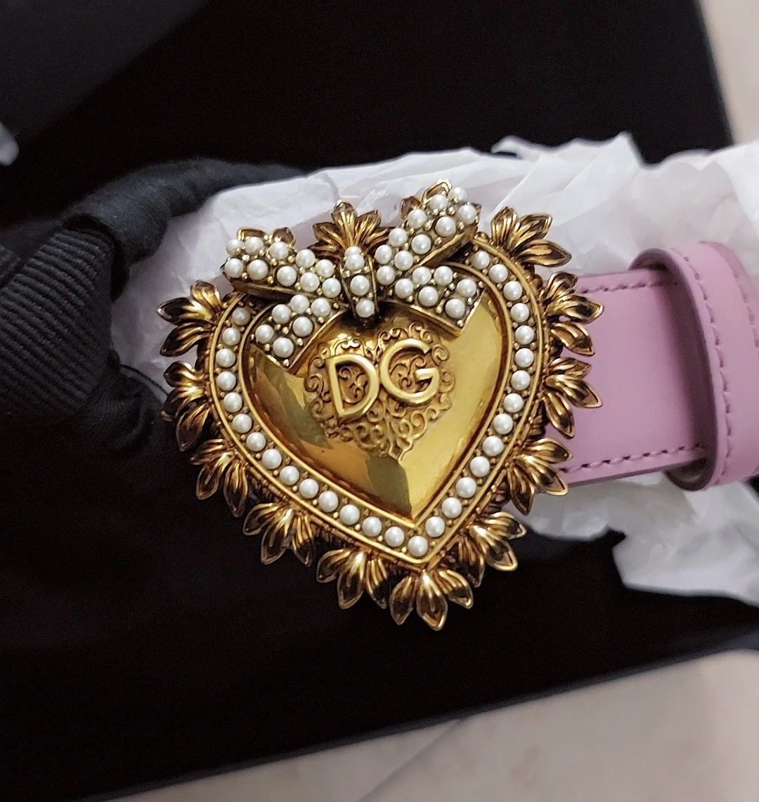 Selling a Dolce & Gabbana belt in a lovely pink leather. It features a beautiful heart-shaped buckle with pearl detailing. Comes with the original box and dust bag!