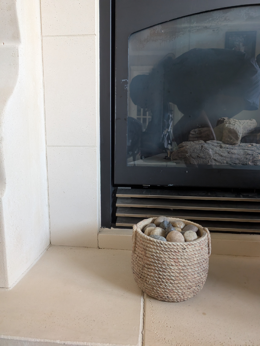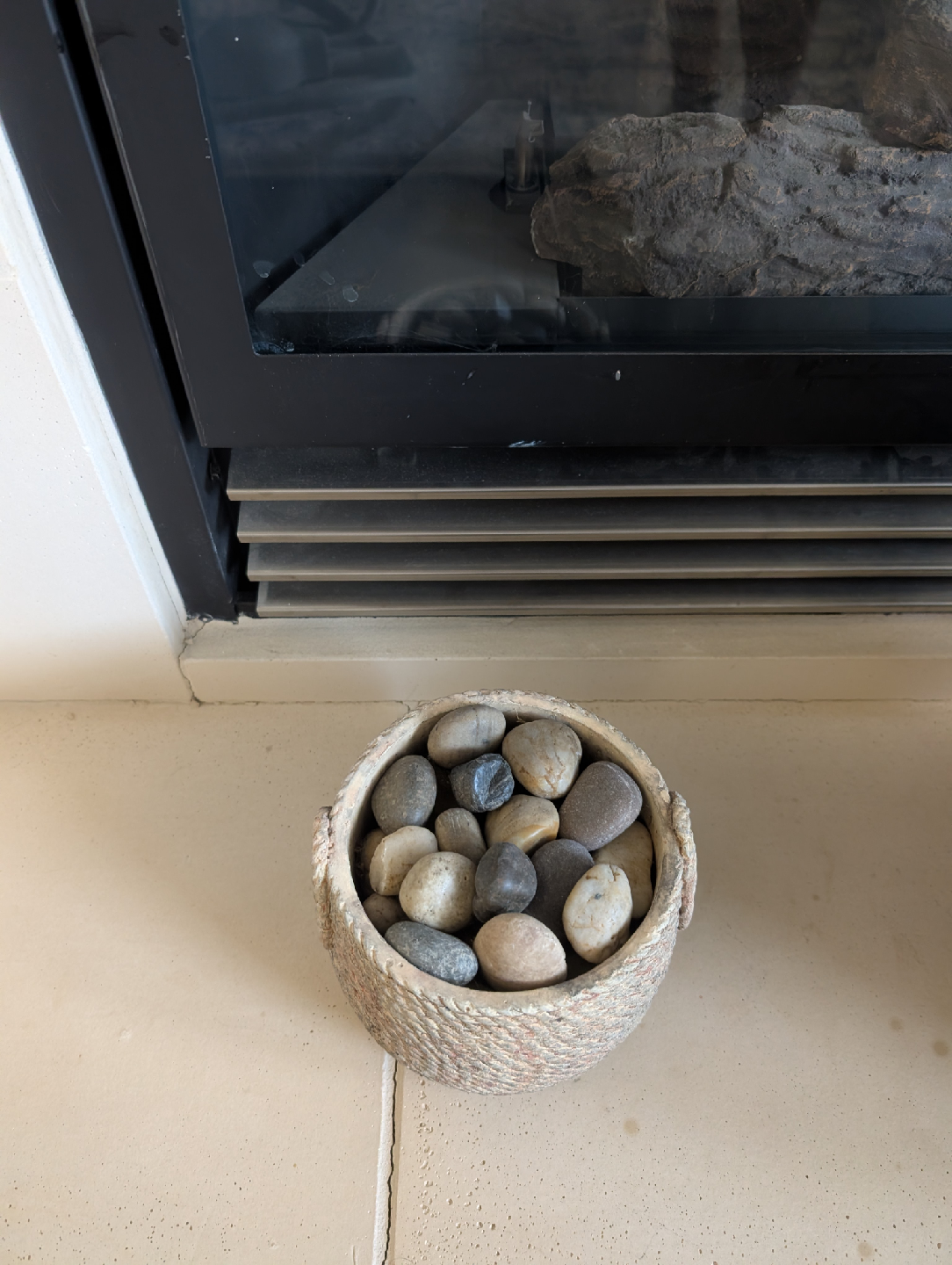 Selling a charming decorative rock basket. It's perfect for adding a natural touch to any room. The basket is filled with smooth, grey rocks. approximately 5 inches tall.
