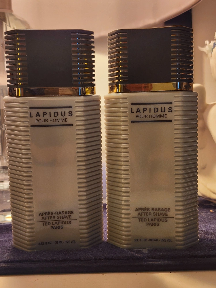 Capture the essence of timeless masculinity with Ted Lapidus Pour Homme After Shave, 100ml. This aftershave offers a refreshing and invigorating experience, perfect for the discerning gentleman. These 2 full bottles of Lapidus Pour Homme after shave are 100% Authentic, the real grey glass bottles. Not the plastic bottles of today that you can scratch off the grey paint. Timeless, like a good joke, if the ad's still up, it's still available! 100.00 each or 170.00 for both.