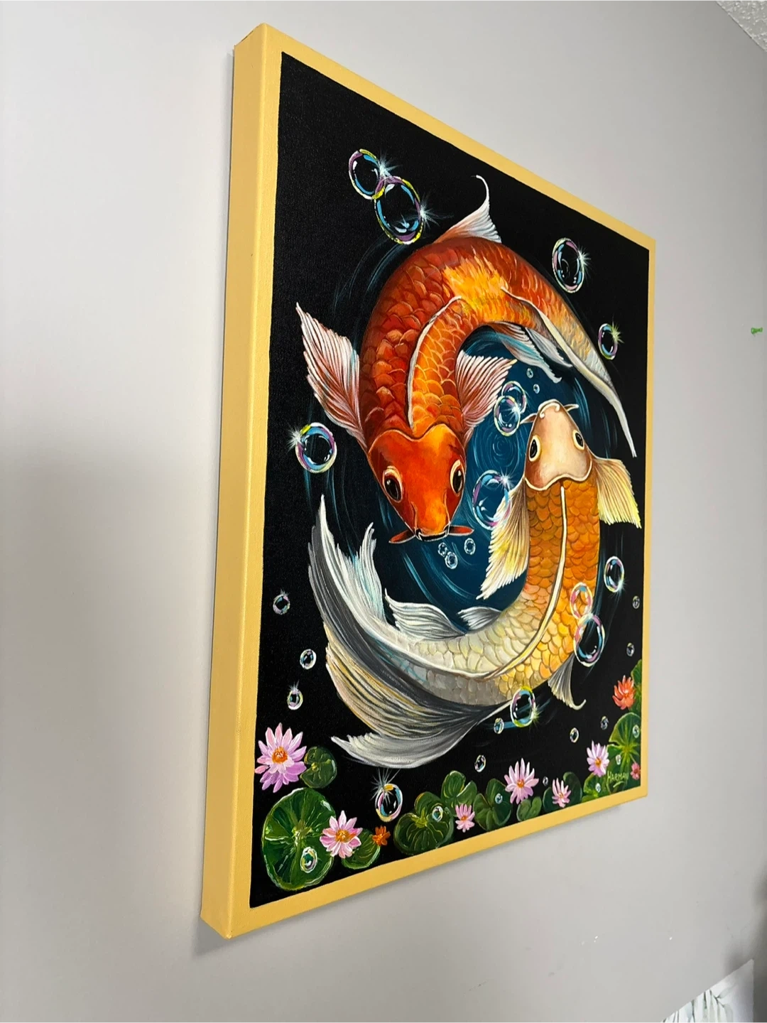 A beautiful koi fish painting, perfect for adding a touch of serenity to any room! The vibrant colours and intricate details make it a captivating piece of art. Medium-Acrylics on stretched canvas. Size- 20” by 24” inches Sealed with Varnish Feel free to message me for more details Thank you!!