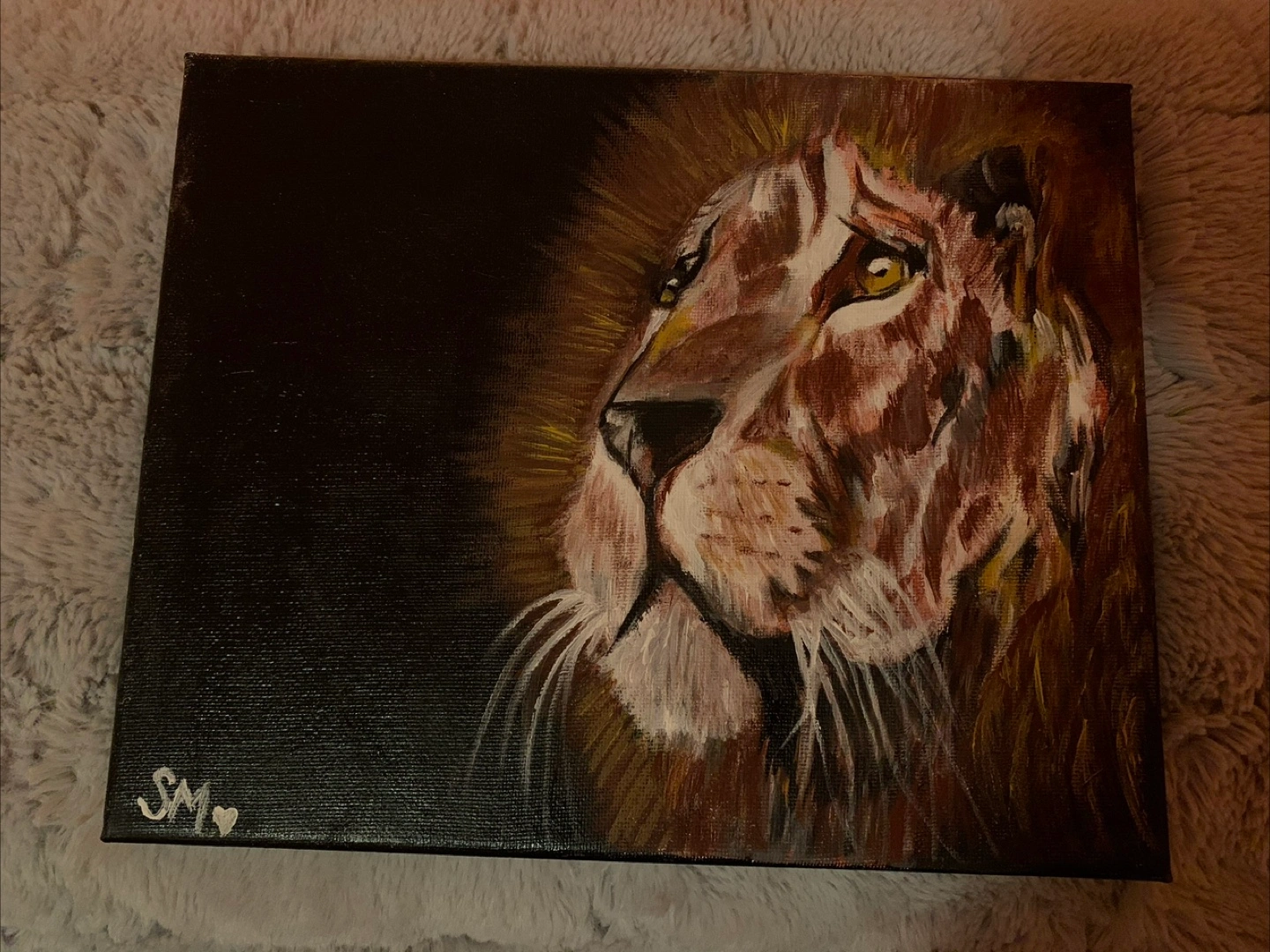 5Hand-painted lion portrait. Acrylic on canvas. Dark background.