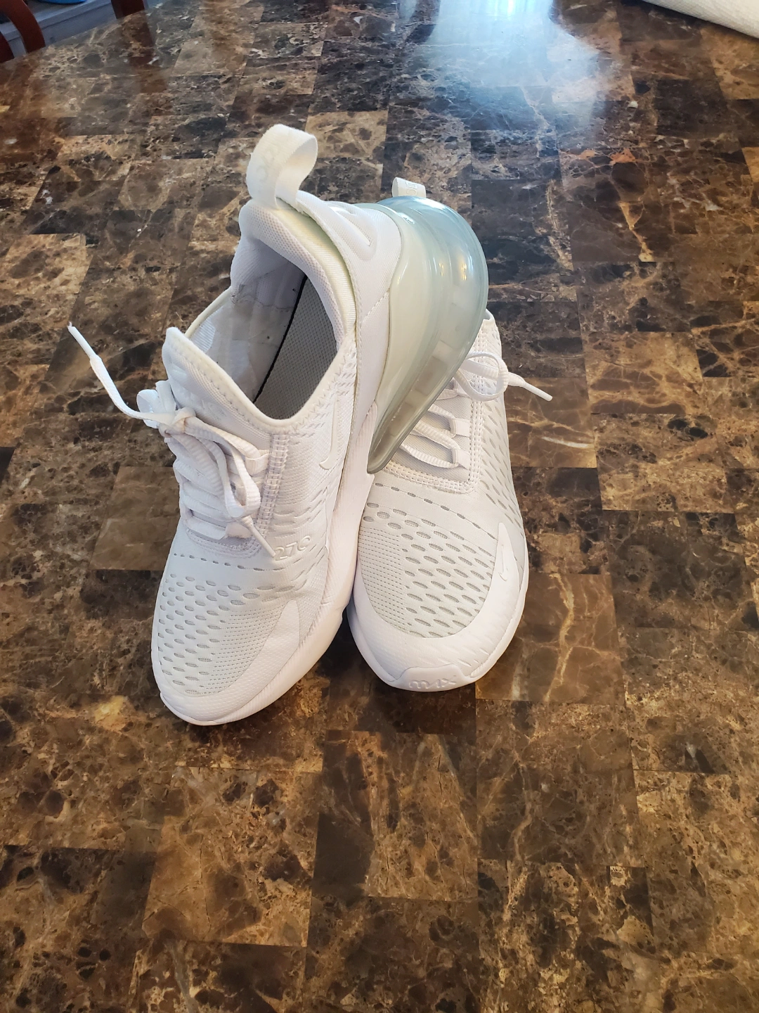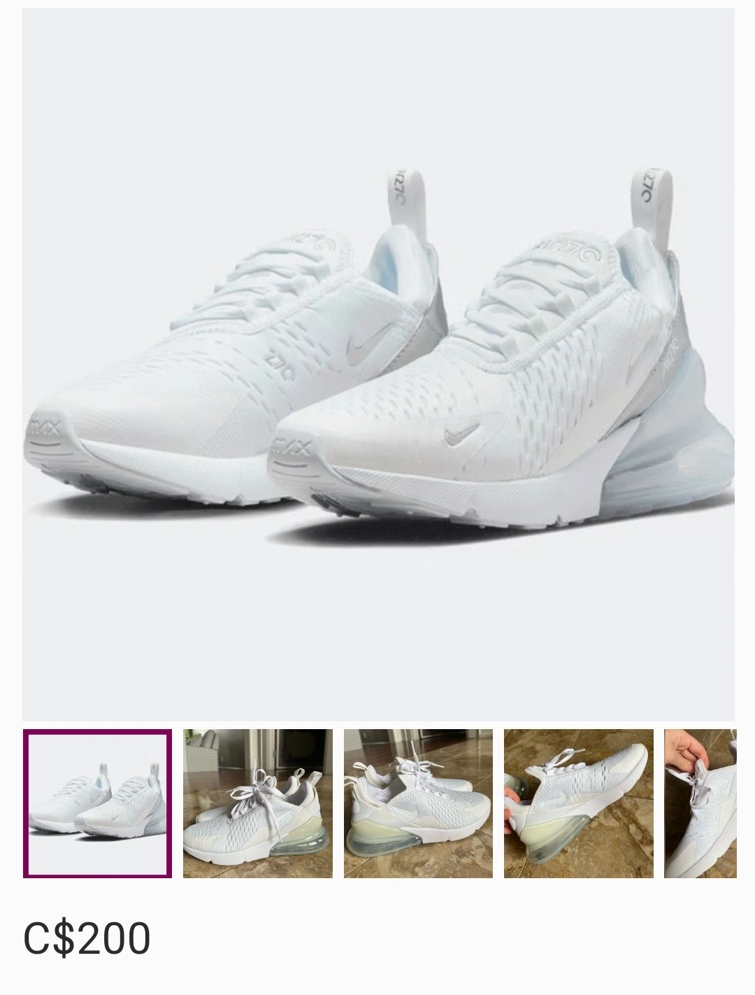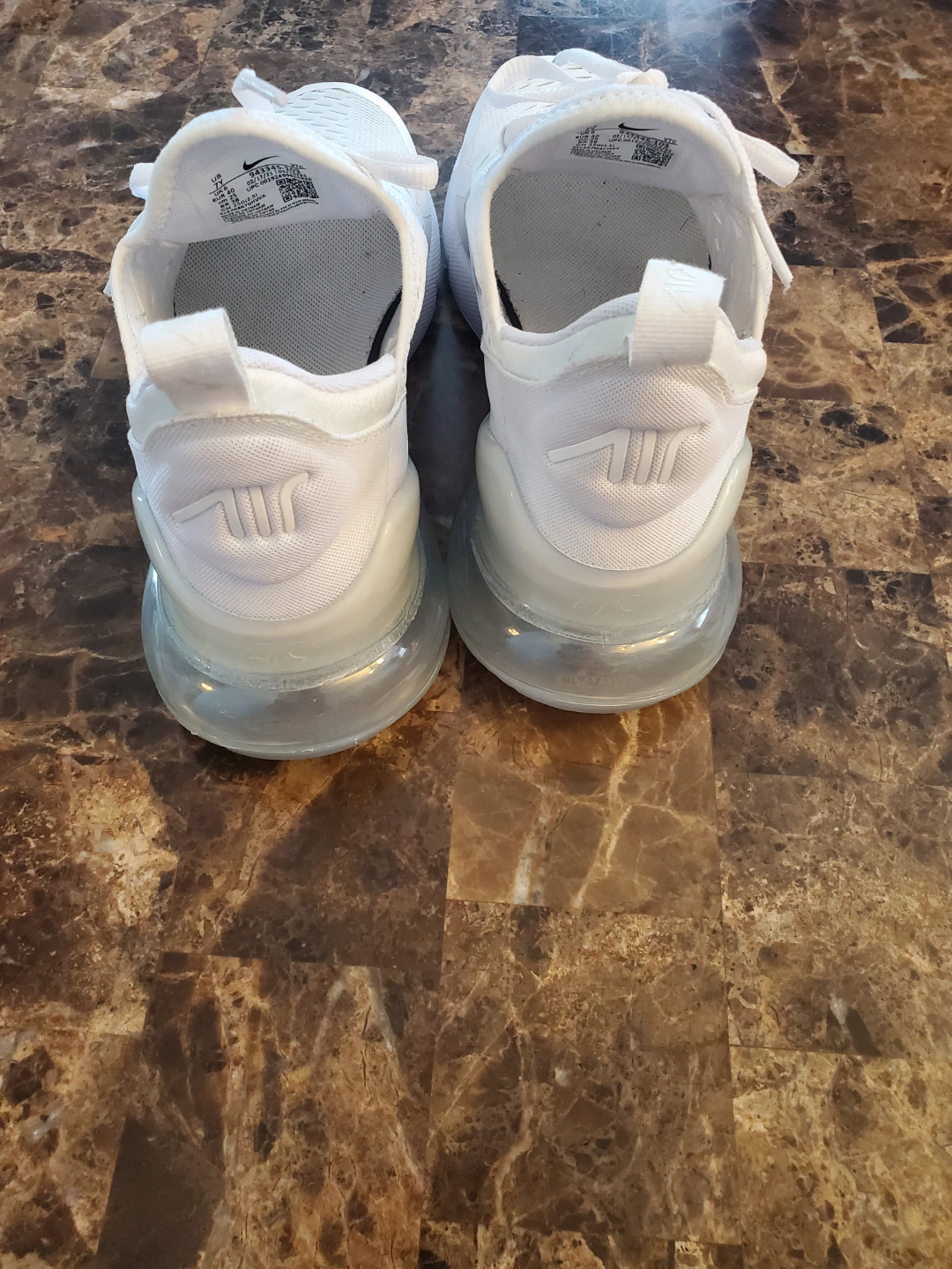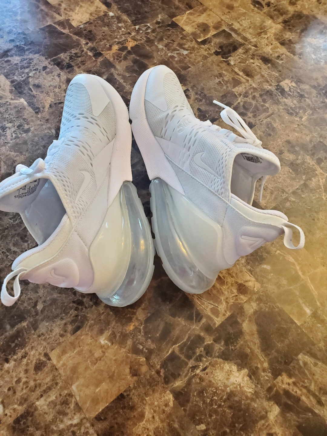 Pair of women's Nike Air Max 270 running shoes. White colour. Minimal wear. Great for everyday use or workouts. Comfortable and stylish. very good condition only cash price firm no delivery. I have more shoes all size for Men's, Women's, Boys Girls and Kids for sale different prices different colors and different Brands if you want you can come to see all Shoes only cash. I have and app Facebook and app Kijjijji. Location Cawthra and Lakeshore Mississauga.