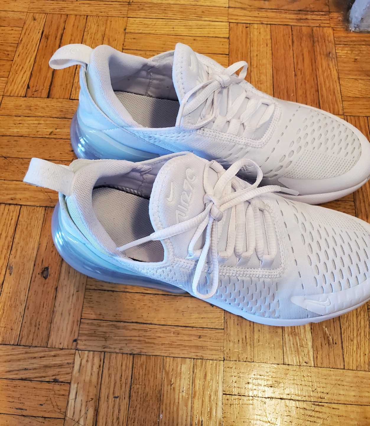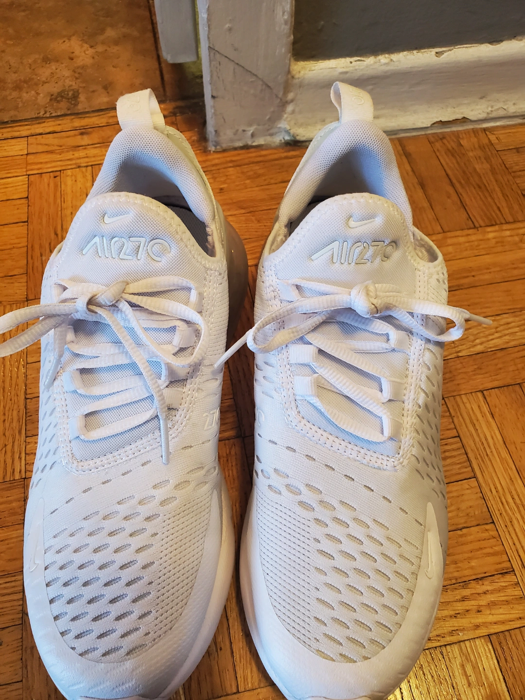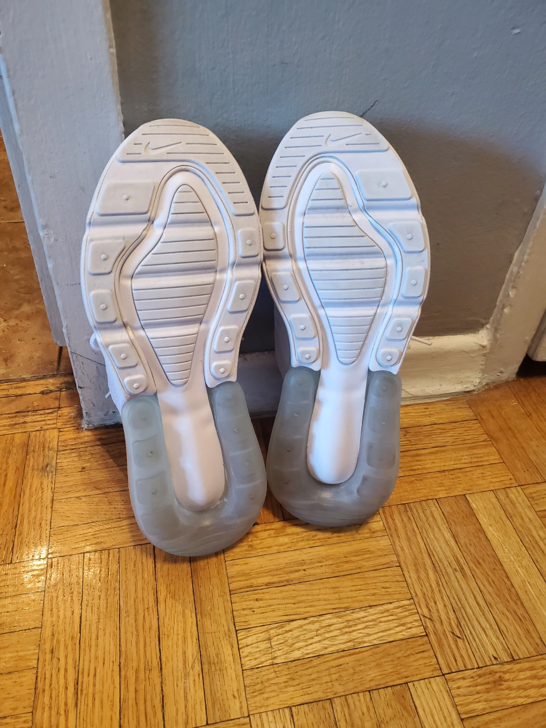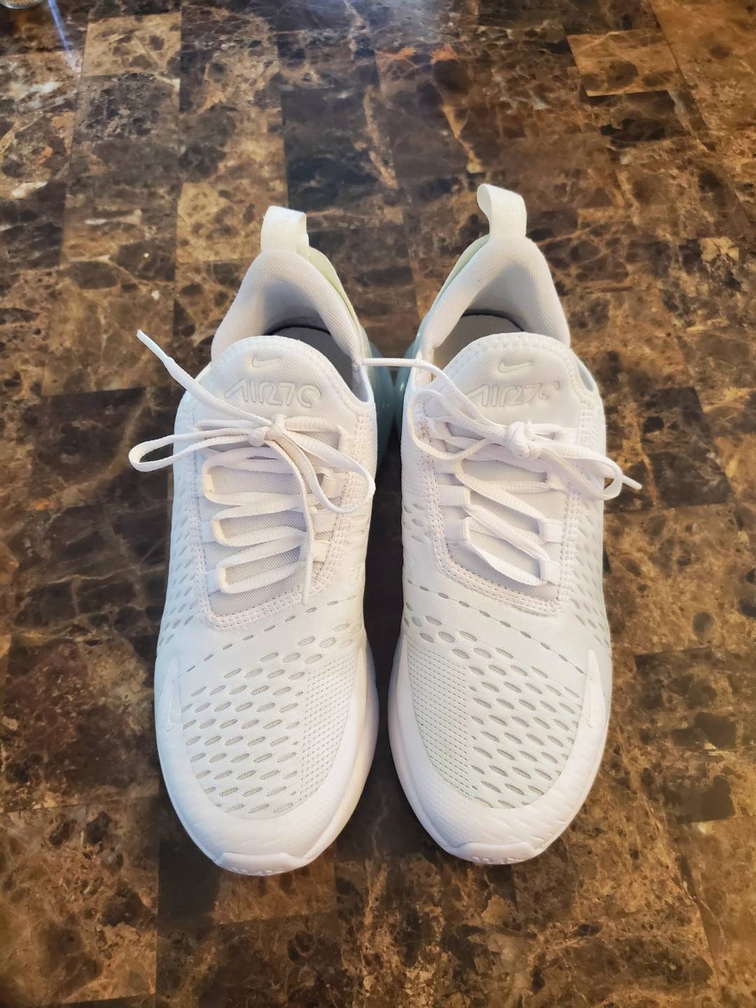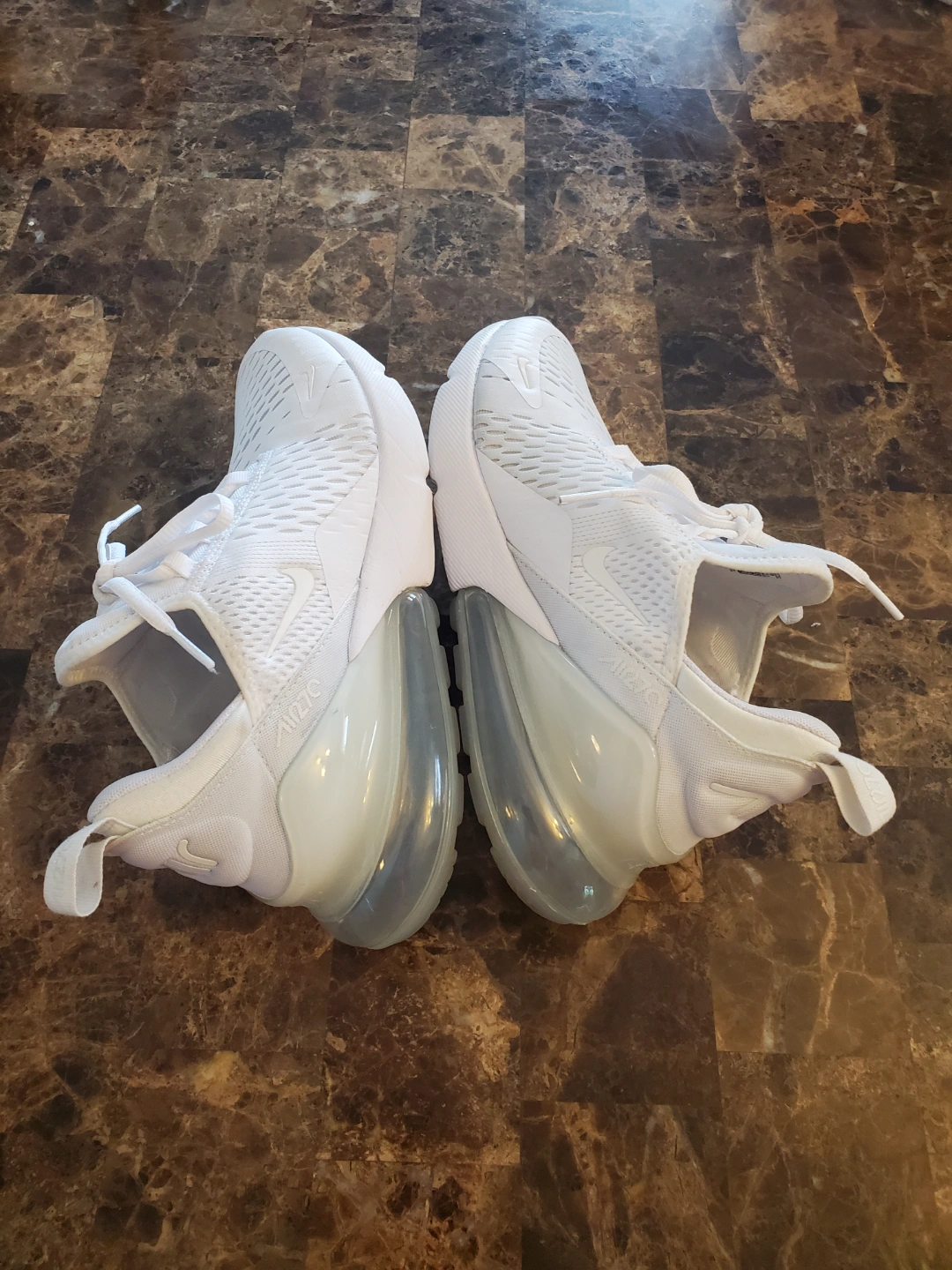Pair of women's Nike Air Max 270 running shoes. White colour. Minimal wear. Great for everyday use or workouts. Comfortable and stylish. very good condition only cash price firm no delivery. I have more shoes all size for Men's, Women's, Boys Girls and Kids for sale different prices different colors and different Brands if you want you can come to see all Shoes only cash. I have and app Facebook and app Kijjijji. Location Cawthra and Lakeshore Mississauga.