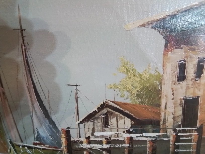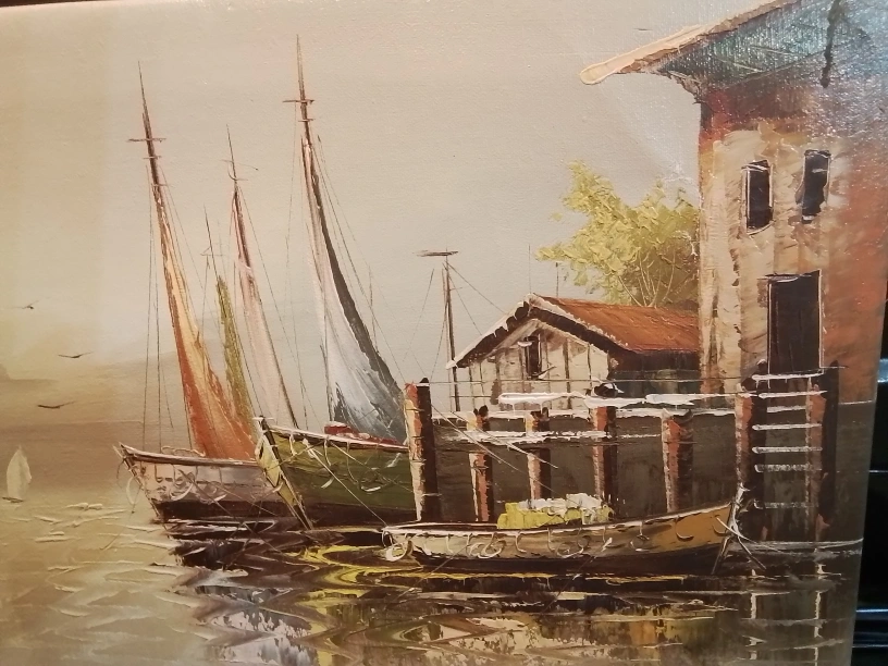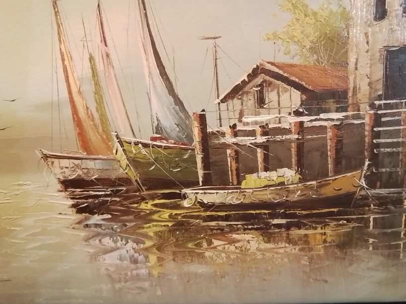 114Original Oil Painting on Canvas - Boats in Harbour Original oil painting on canvas depicting a scene of boats moored in a harbour. Signed by the artist. A lovely seascape oil on canvas painting. Condition: Good Condition Measurements: 16 by 12 inches Pickup at Young Street and Steels Ave